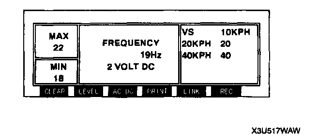 Note: The selected threshold voltage indicated on the FREQUENCY METER SCREEN should be 2 VOLTS DC. If an incorrect threshold voltage is selected, the calculated frequency value will be incorrect. Threshold voltage should be in the DC range. Press AC/DC key to select DC range.