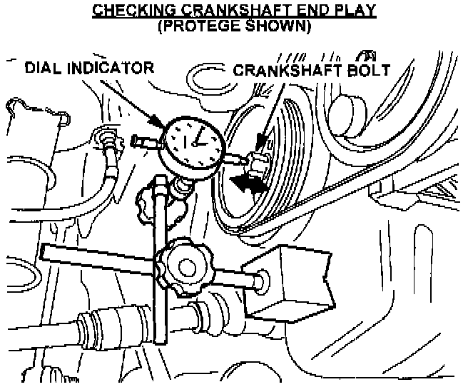 2. Using a dial indicator. measure and record the crank shaft end play as shown (Protege). Rotate the crankshaft 180°, and again measure and record the crankshaft end play.