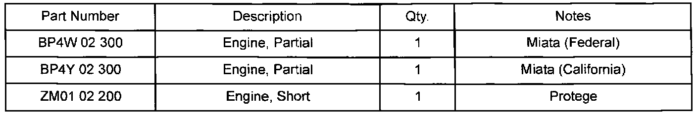 Part Number Main Cause BP4W-02-300 Engine Partial (Miata - Federal)