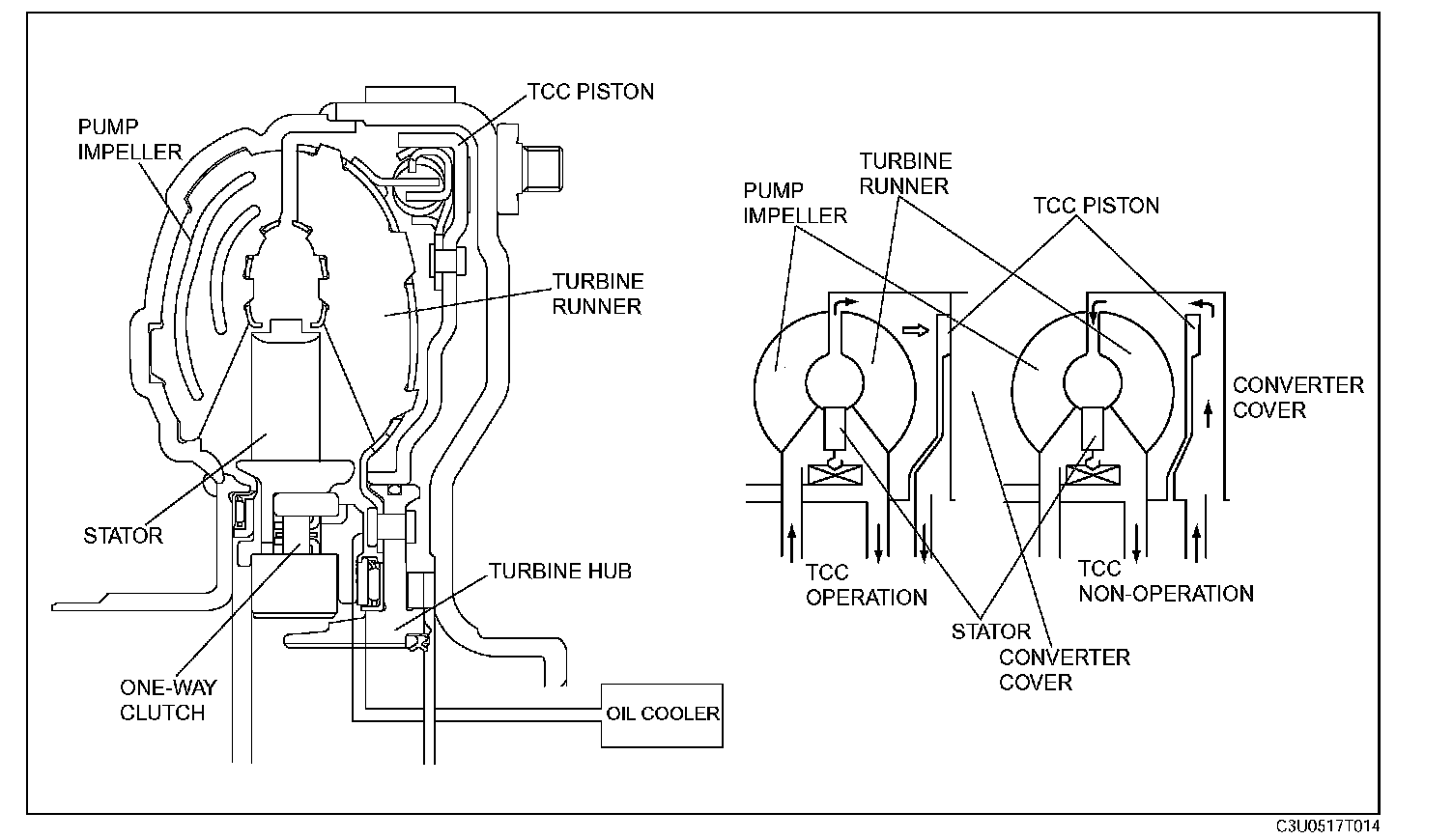 TORQUE CONVERTER STRUCTURE^ The torque converter with the TCC control consists of the turbine runner, pump impeller, stator, and the TCC piston as shown in the figure. The TCC piston engages with the turbine runner and slides on the turbine hub to be pushed and contacts with the torque converter cover during the TCC control operation. In the TCC piston, a spring for torsion damper is installed to absorb the engine torque fluctuation during TCC control.
