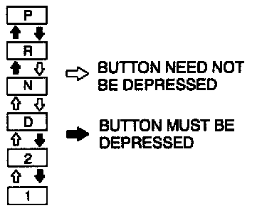 2. With the brake pedal depressed, verify that "click" sound is heard at each range when shifted in the pattern shown.