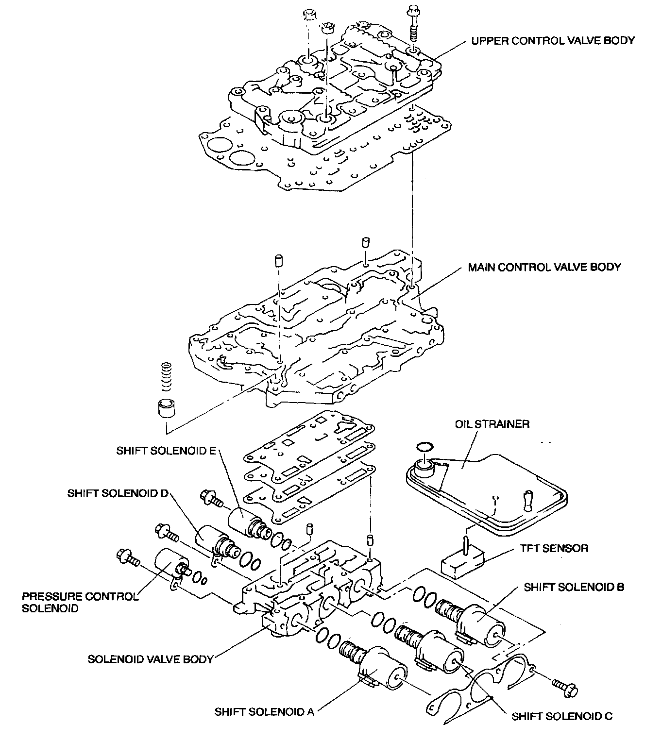 - The control valve body is composed of three bodies: the upper control valve body, main control valve body, and the solenoid valve body.