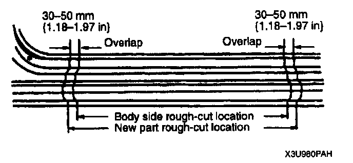 - For cut-and-join areas, allow for an overlap of 30-50 mm (1.18 -1.97 in) with the remaining area on the body side and then rough-cut the new parts.