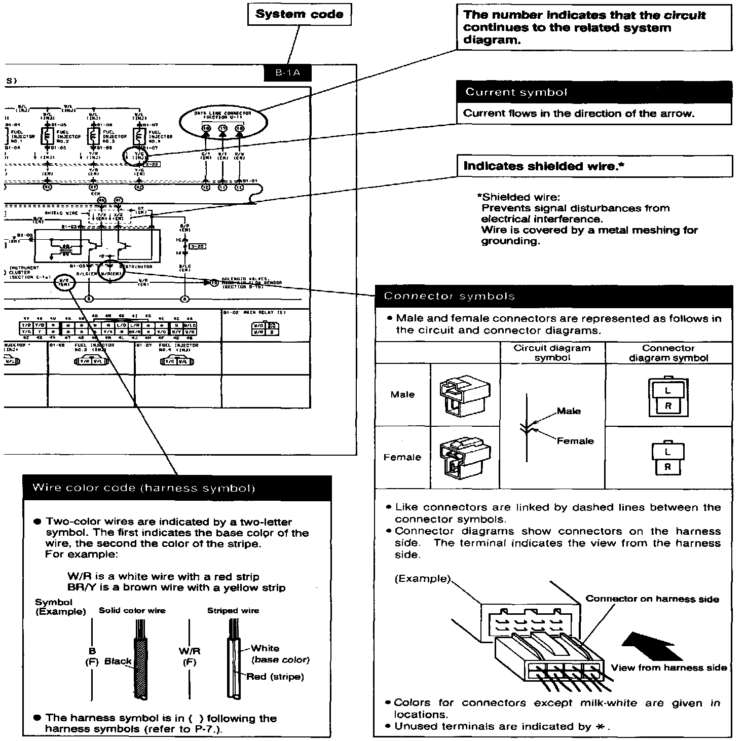 These show the circuits for each system, from the power supply to the ground. The power supply side is on the upper part, the ground side on the lower part. The diagrams describe circuits with the ignition switch off.