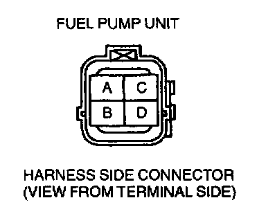 - Fuel pump relay connector terminal C and fuel pump unit connector terminal B through common connector to Ground