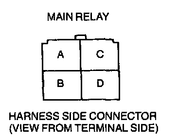 - Power circuit (fuel pump relay connector terminal A or E and main relay connector terminal D through common connector)