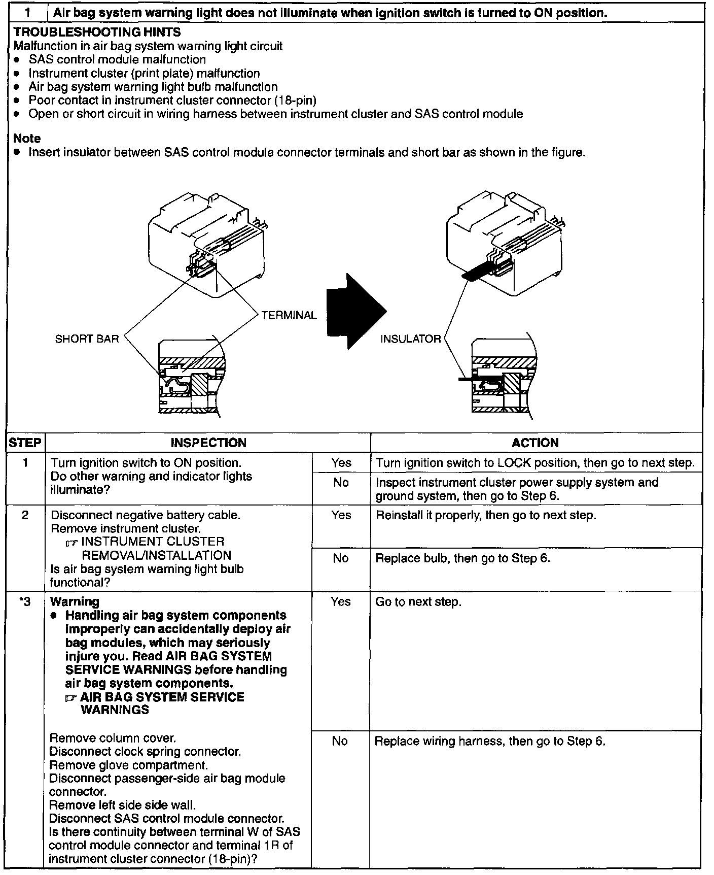 Air bag system warning light does not illuminate when ignition switch is turned to ON position.