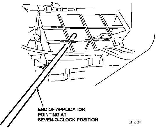 4. Insert the applicator in the grille of the recirculation door. Point the nozzle tip downwards (approximately at the 7 o'clock position) and towards the center of the cooling unit.