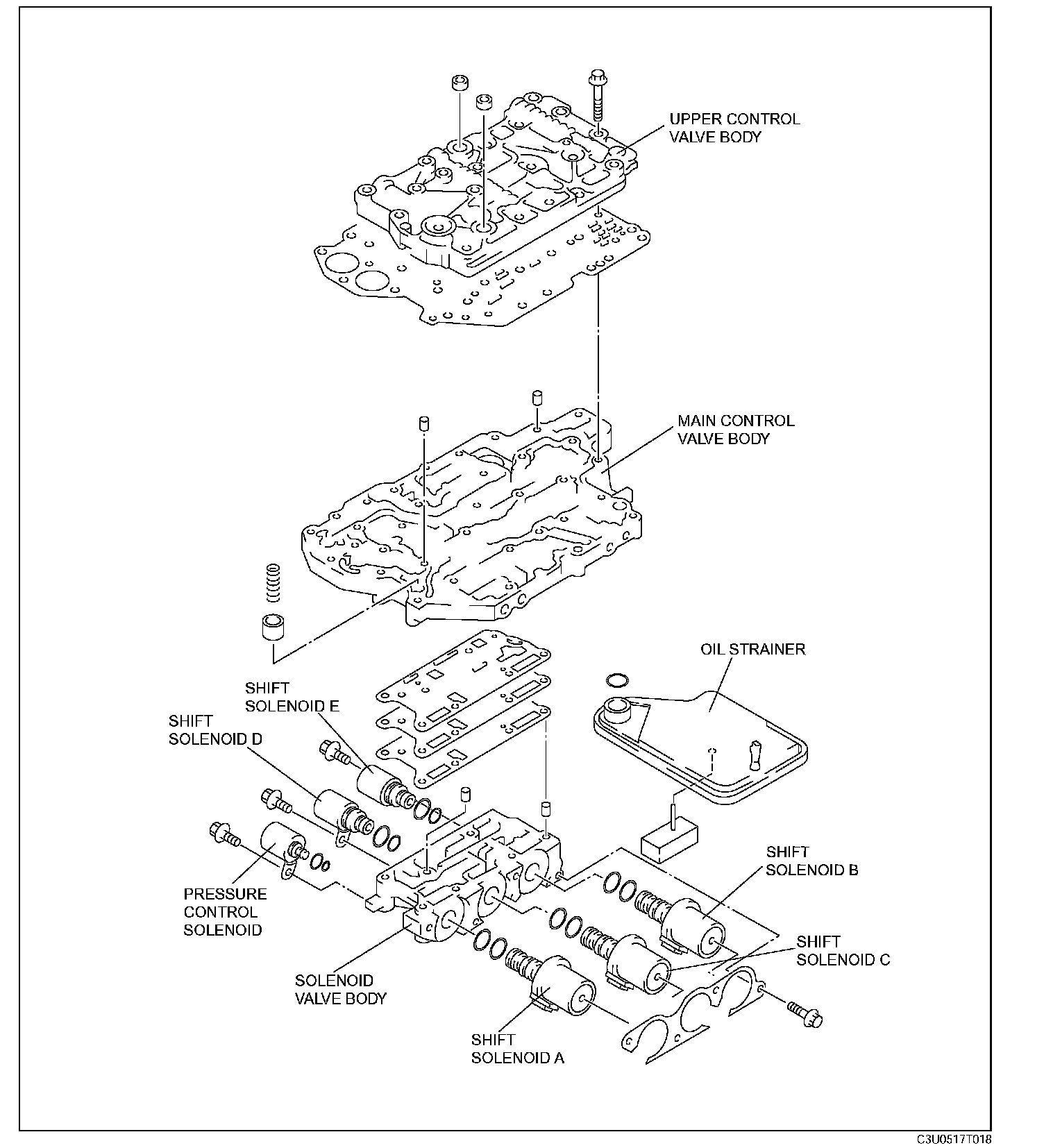^ The control valve body is composed of three bodies: the upper control valve body, premain control valve body, and the solenoid control valve body.
