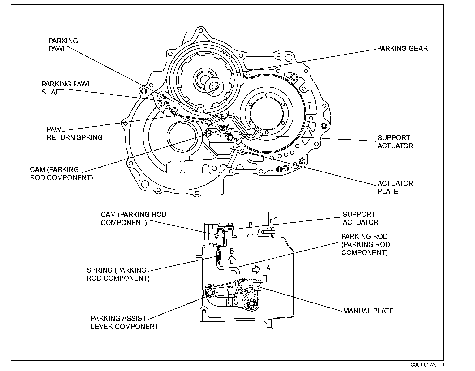 PARKING MECHANISM OPERATION^ When the selector lever is moved to P position, the manual shaft and the manual plate move in the direction of the arrow A to the position as shown in the figure below. Then the parking rod component moves in the direction of the arrow B, the parking rod component cam pushes up the parking pawl, and the parking pawl engages the parking gear.