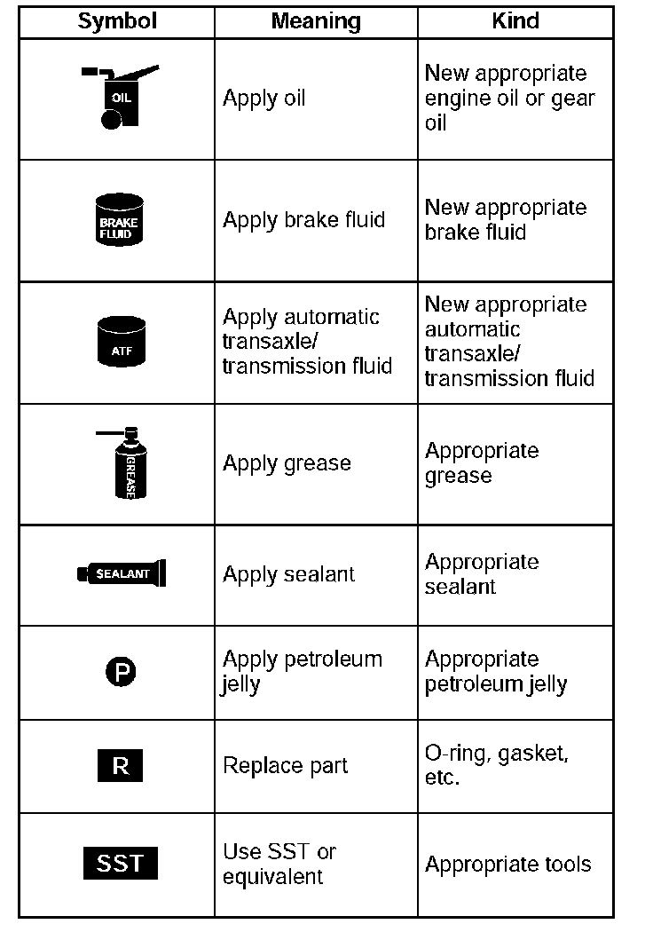 There are eight symbols indicating oil, grease, fluids, sealant, and the use of SST or equivalent. These symbols show application points or use of these materials during service.