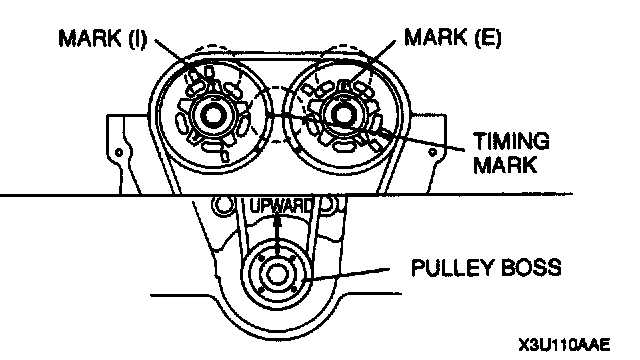 Note: Face the "I" and "E" marks on the camshaft pulley straight up and align the timing marks with the cylinder head upper surface.