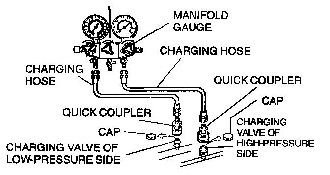 2. Connect the charging hoses to the high- and low-pressure side joints of the manifold gauge.