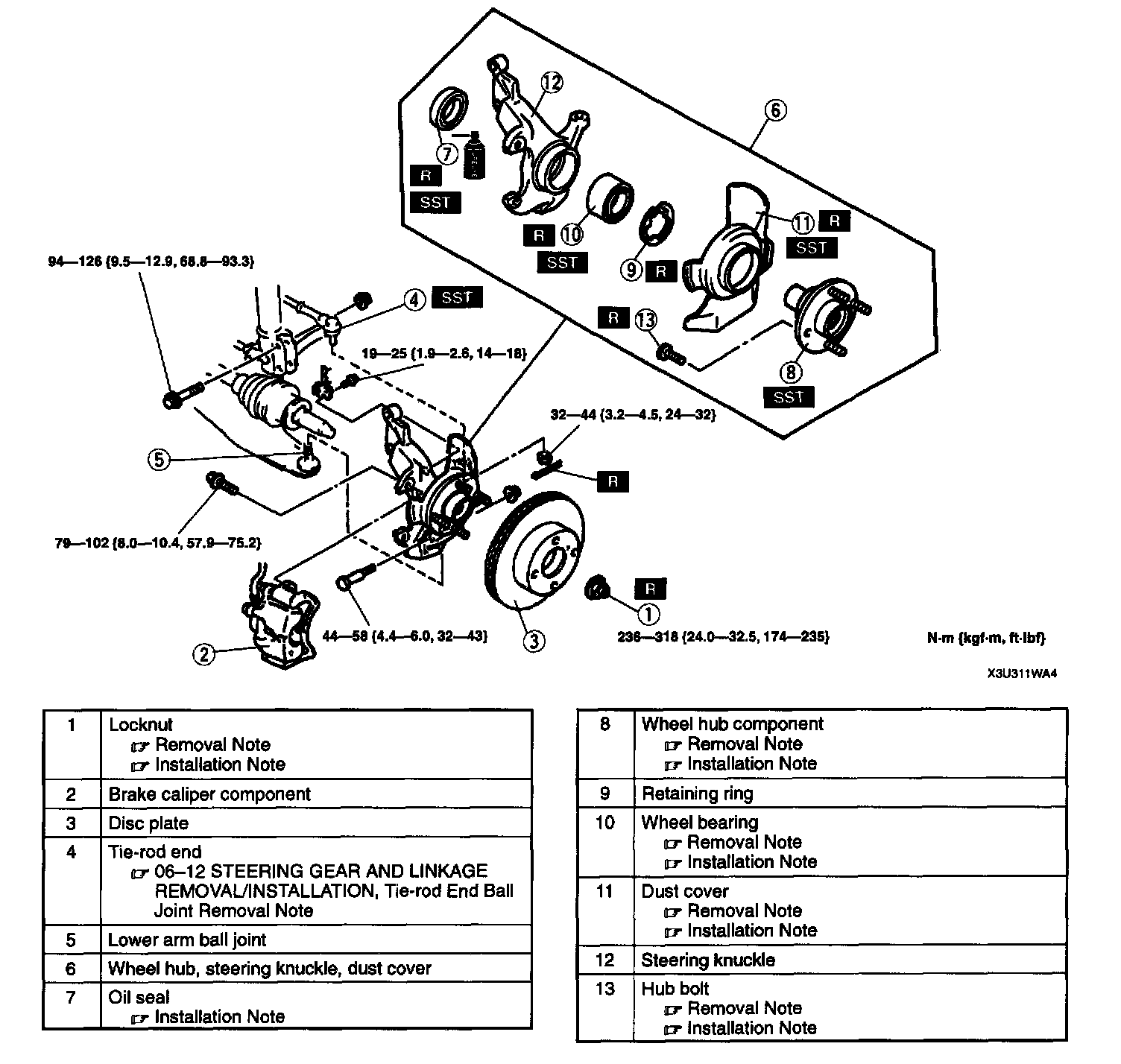 WHEEL HUB, STEERING KNUCKLE REMOVAL/INSTALLATIONCAUTION: Performing the following procedures without first removing the ABS wheel-speed sensor may possibly cause an open circuit in the harness if it is pulled by mistake. Before performing the following procedures, remove the ABS wheel-speed sensor (axle side) and fix it to an appropriate place where the sensor will not be pulled by mistake while servicing the vehicle.