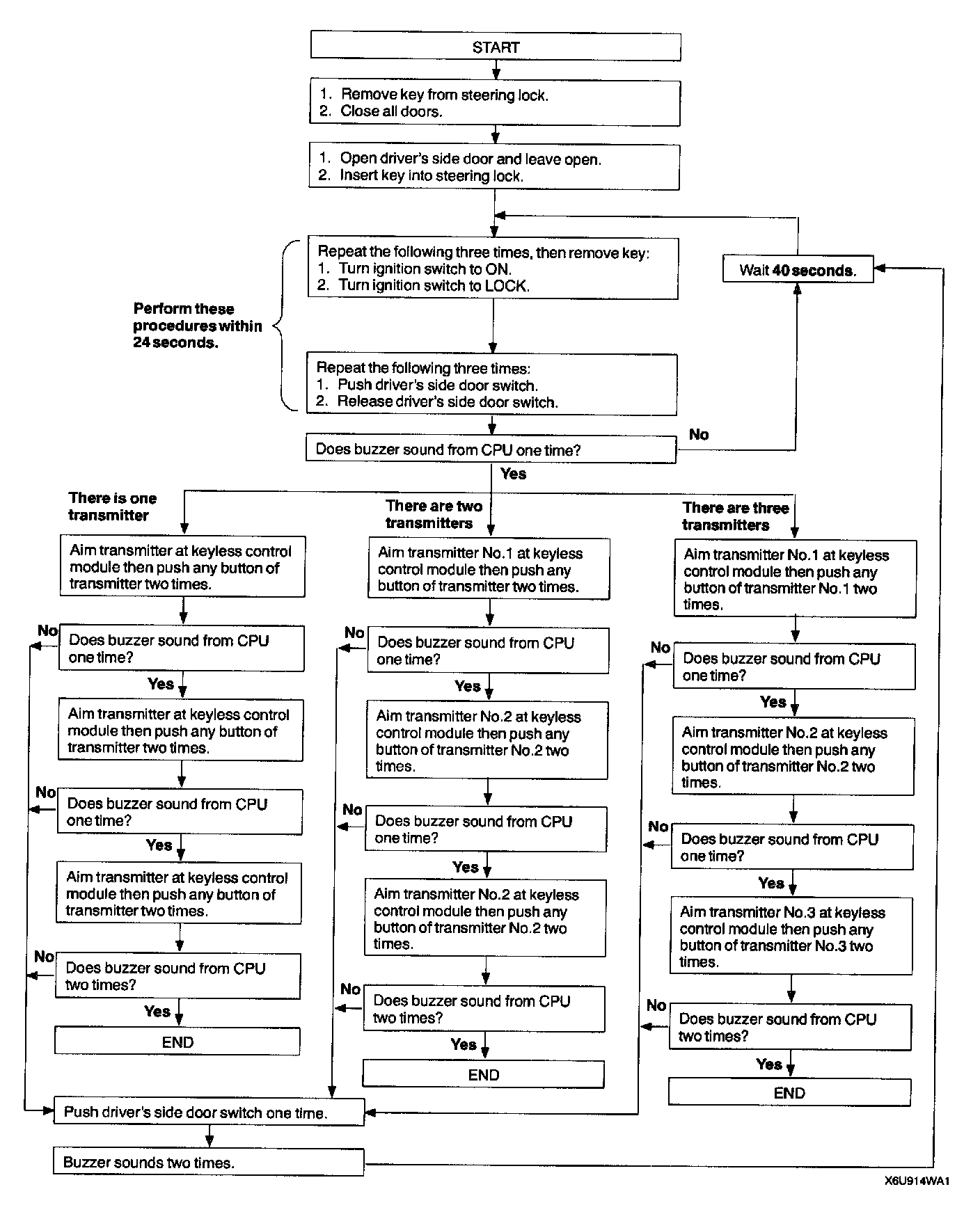 TRANSMITTER ID CODE CHANGECAUTION: Because up to three ID codes can be programmed into the keyless control module, the vehicle may be stolen with the ID code of an unused transmitter. In order to prevent this, the ID codes for all three transmitters must be reprogrammed when reprogramming an ID code. Also, when one or two transmitters are used, the ID code must be programmed three times with the same transmitter.