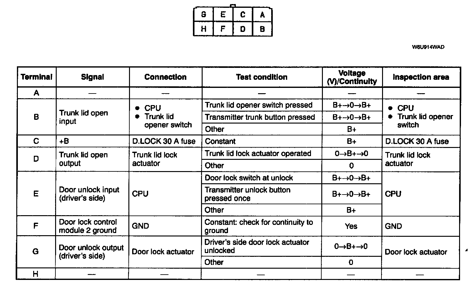NOTE: Disconnect the door lock control module 2 connector before checking for continuity at terminal F.Terminal Voltage List (Reference):