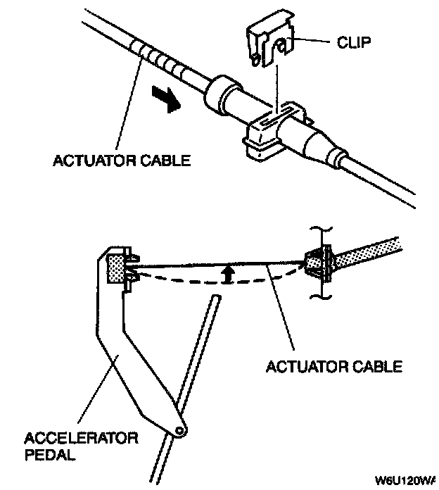 1. Remove the clip.2. Pull the actuator cable until the throttle lever starts moving to eliminate the actuator cable play.