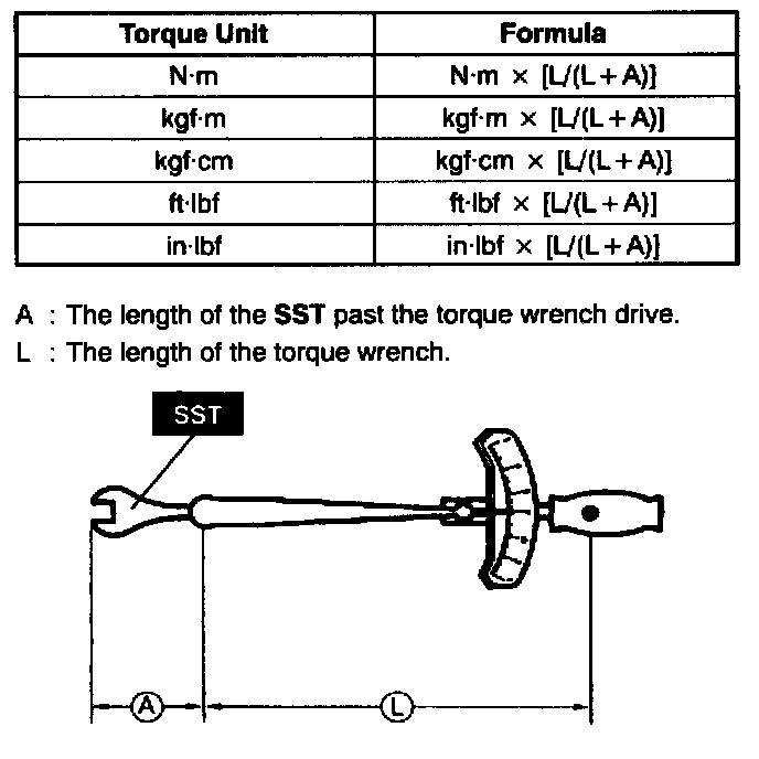 - When using a torque wrench-SST or equivalent combination, the written torque must be recalculated due to the extra length that the SST or equivalent adds to the torque wrench. Recalculate the torque using the following formulas. Choose the formula that applies to you.