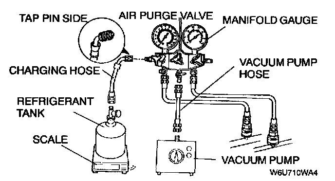 CAUTION: Close the manifold gauge valve Immediately after stopping the vacuum pump. If the valve is left open, the vacuum pump oil will backflow into the refrigeration cycle and cause a decrease in the efficiency of the air conditioner.