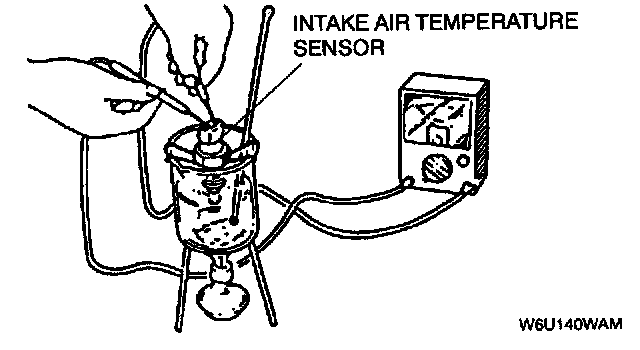 2. Place the intake air temperature sensor in water with a thermometer, and heat the water gradually.