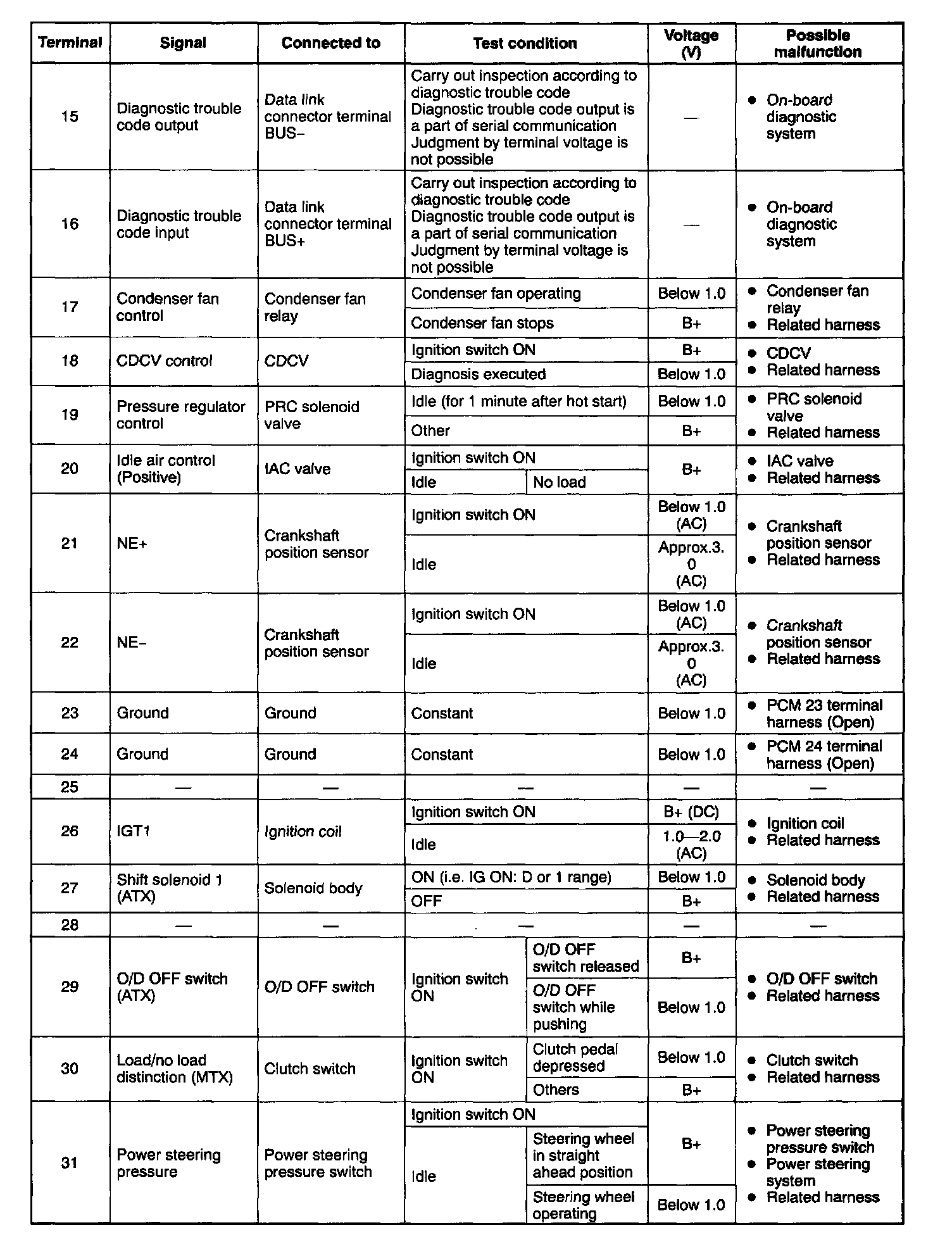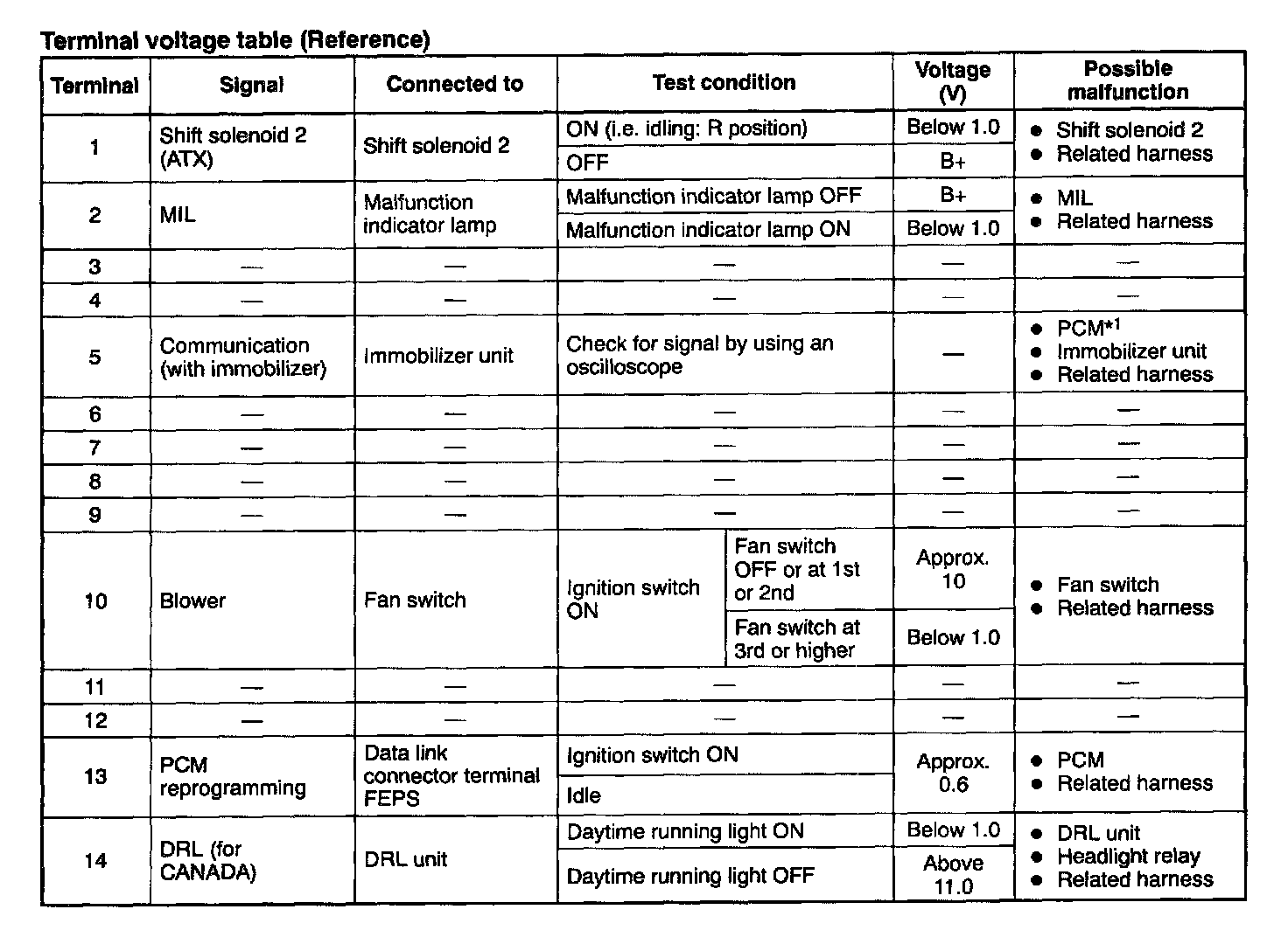 - If any incorrect voltage is detected, check related systems, wiring harnesses and connectors referring to the possible malfunction in the terminal voltage list.