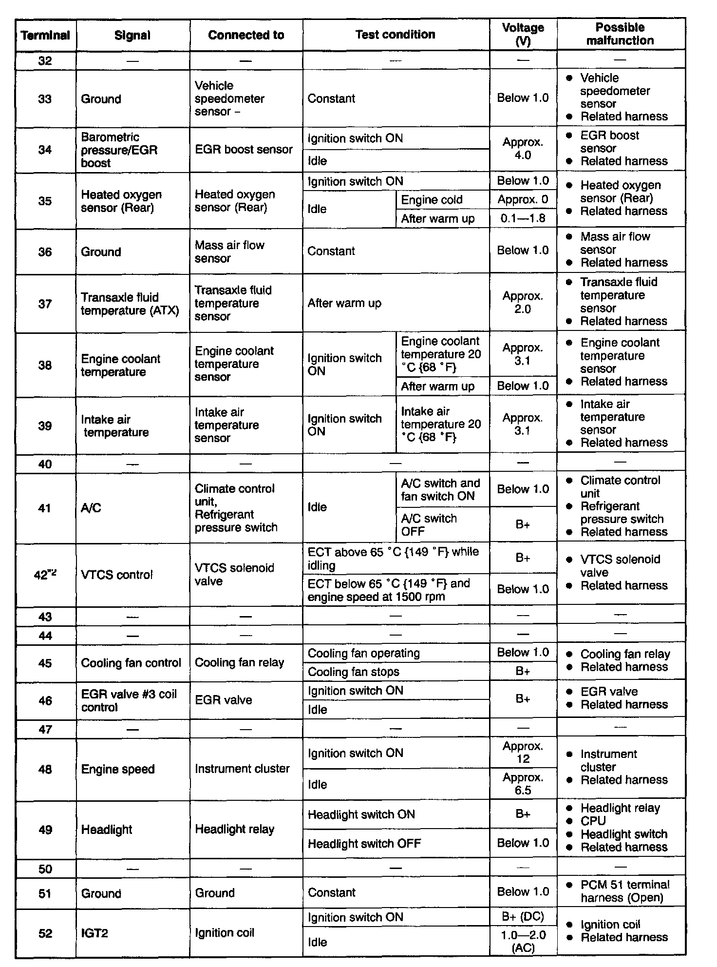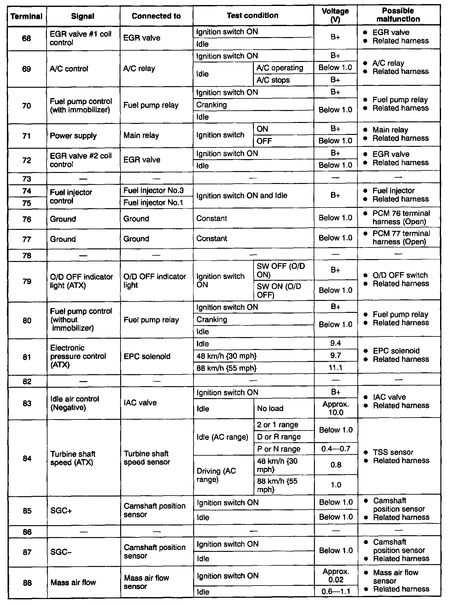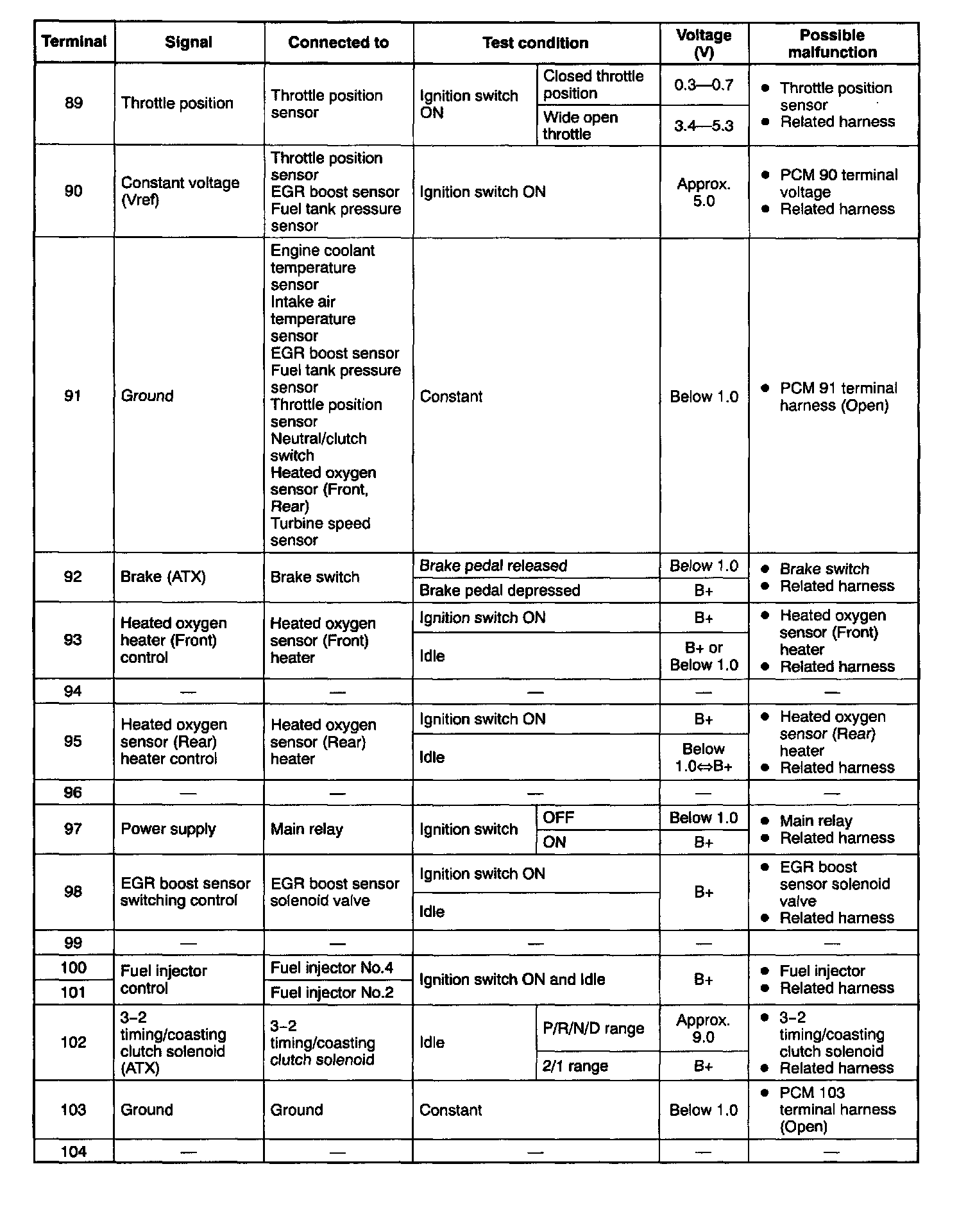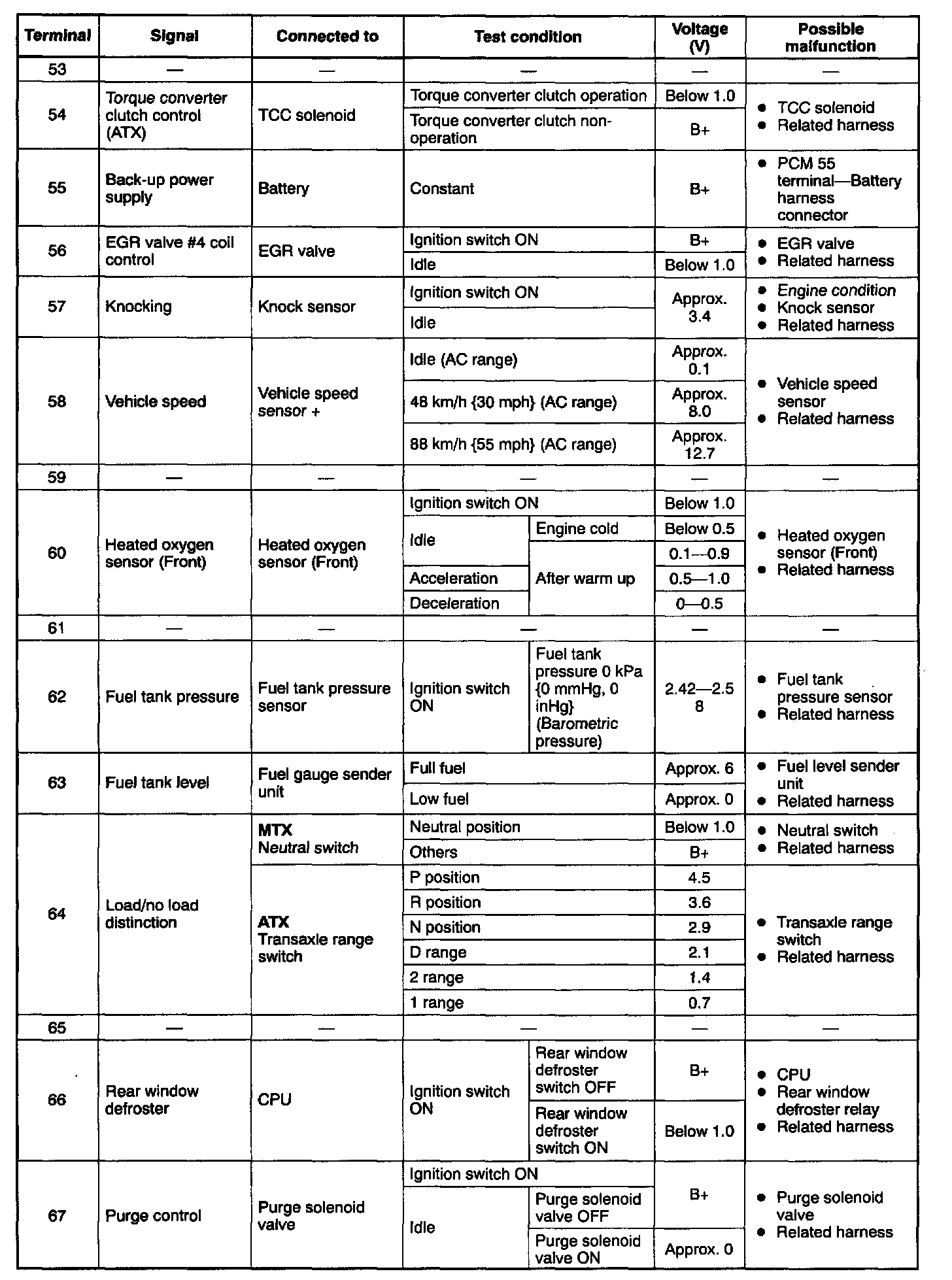 CAUTION: The PCM terminal voltages vary with change in measuring conditions and vehicle conditions. Always carry out a total inspection of the Input systems, output systems, and PCM to determine the cause of trouble. Otherwise, a wrong diagnosis will be made.Using 104 Pin Breakout Box