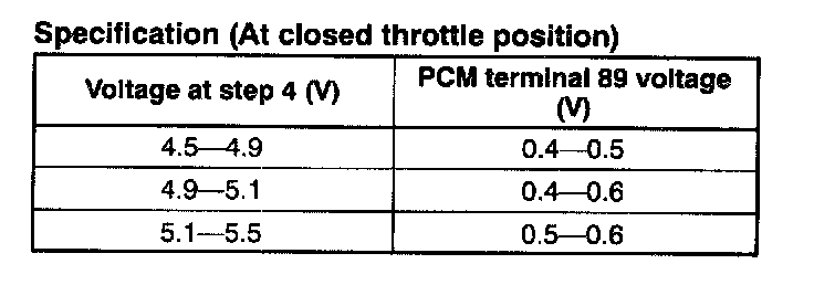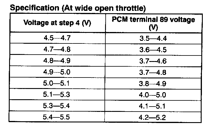 8. When the throttle valve is at the wide open throttle, verity that the PCM terminal 89 voltage is in the specification.
