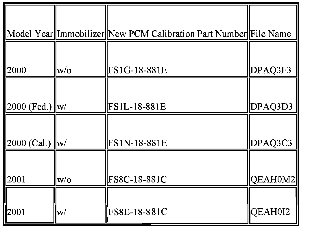The PCM Calibration Part Numbers listed above are provided for PCM reprogramming purposes only. These are not necessarily the same Mazda part numbers used to order an actual PCM through the Mazda Parts System. It is not necessary to order a PCM as part of this repair procedure.