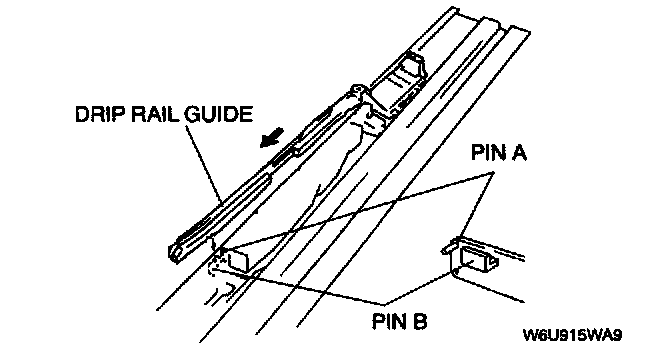 4. Pull the drip rail guide upward to disengage pins A and B from the guide.