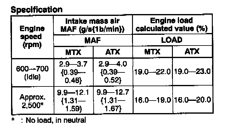 - Mass air flow sensor terminal C voltage: Below 1.0 V
