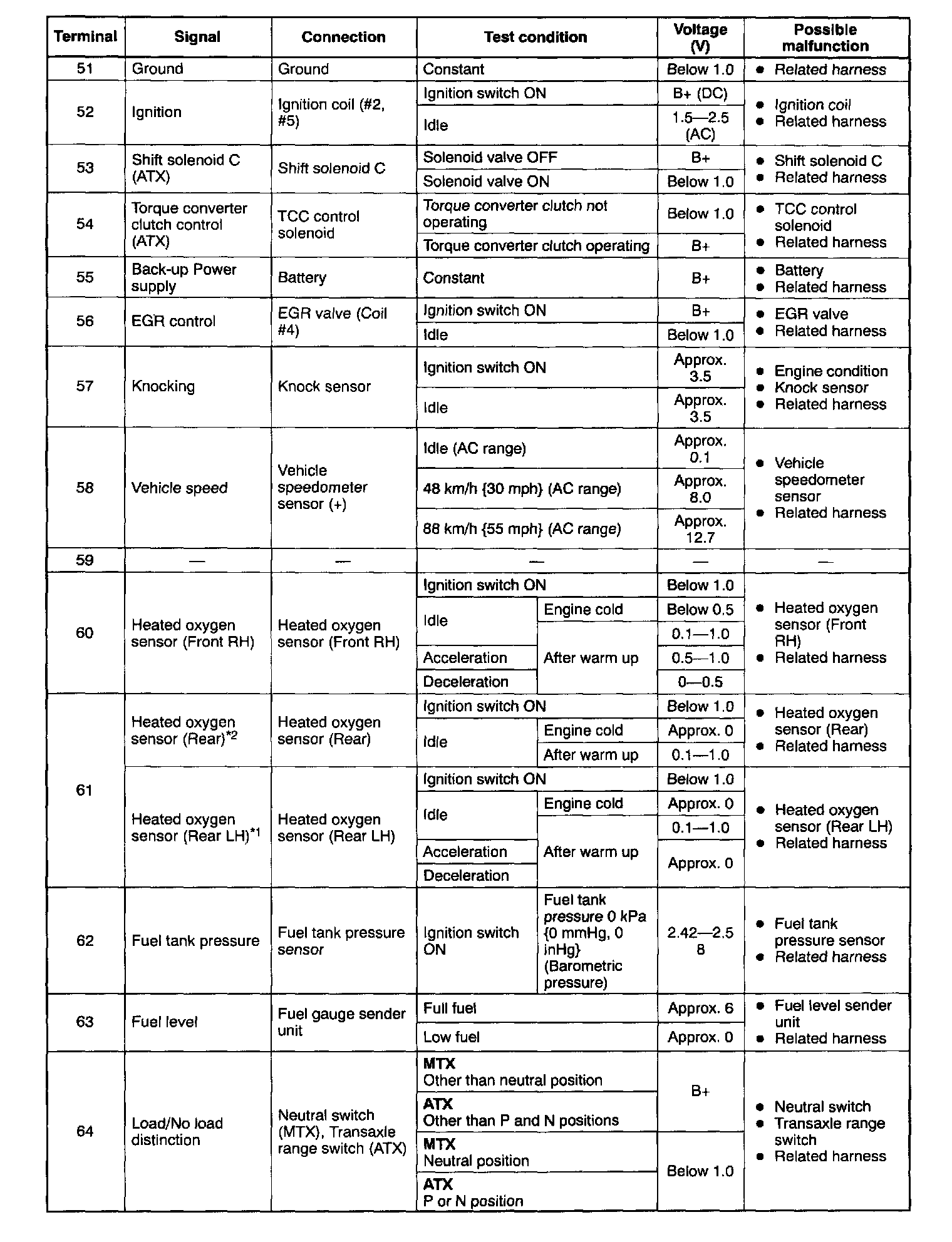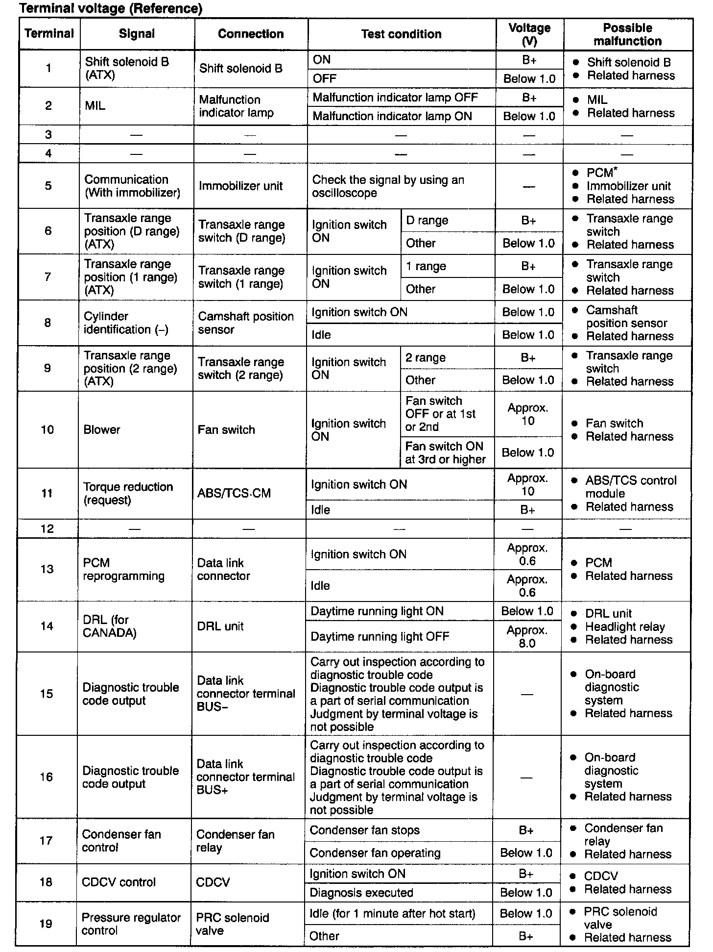 CAUTION: The PCM terminal voltages vary with change in measuring conditions and vehicle conditions. Always carry out a total inspection of the input systems, output systems, and PCM to determine the cause of trouble. Otherwise, some incorrect diagnosis would be made.