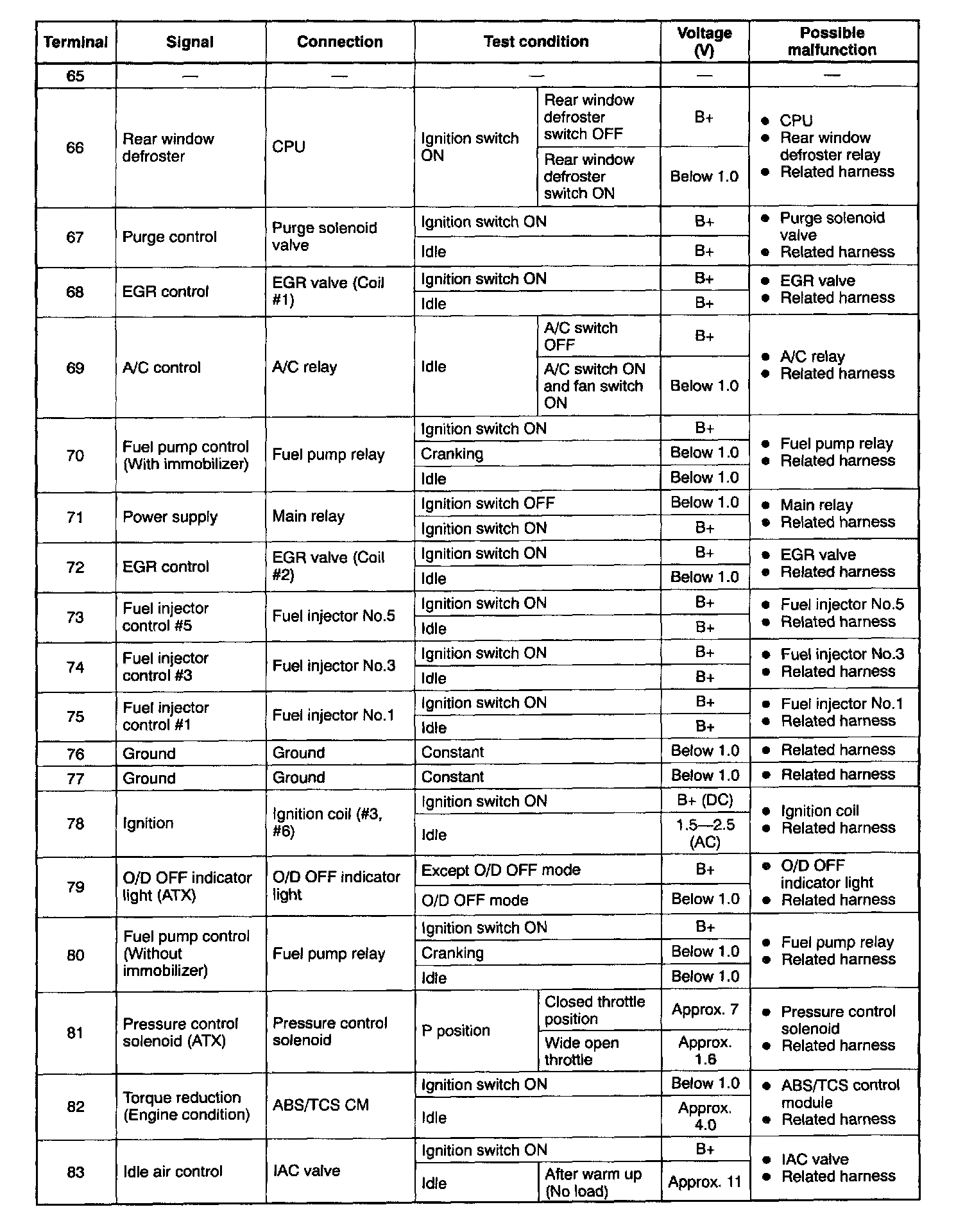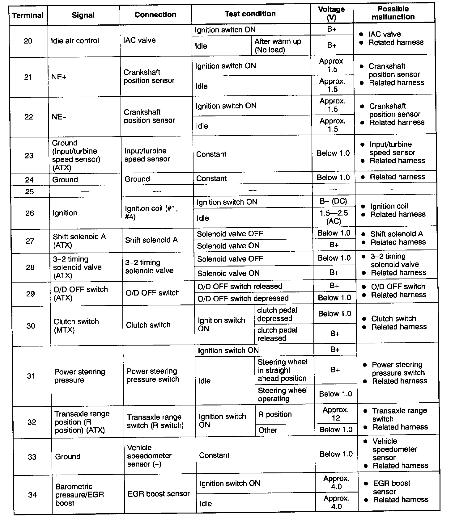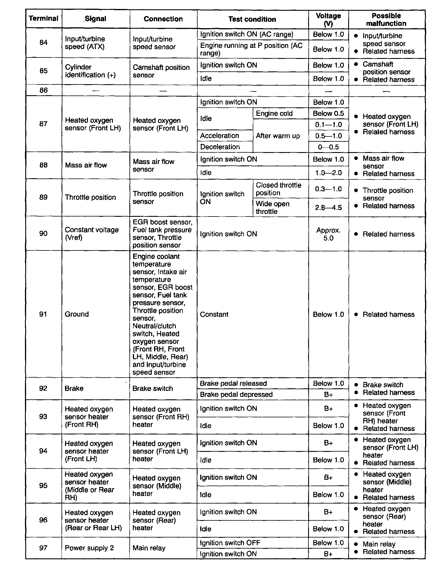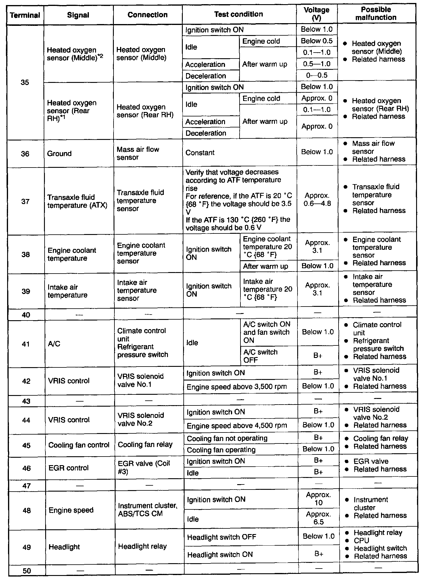 - If any incorrect voltage is detected, check related systems, wiring harnesses and connectors referring to the possible malfunction in the terminal voltage list.
