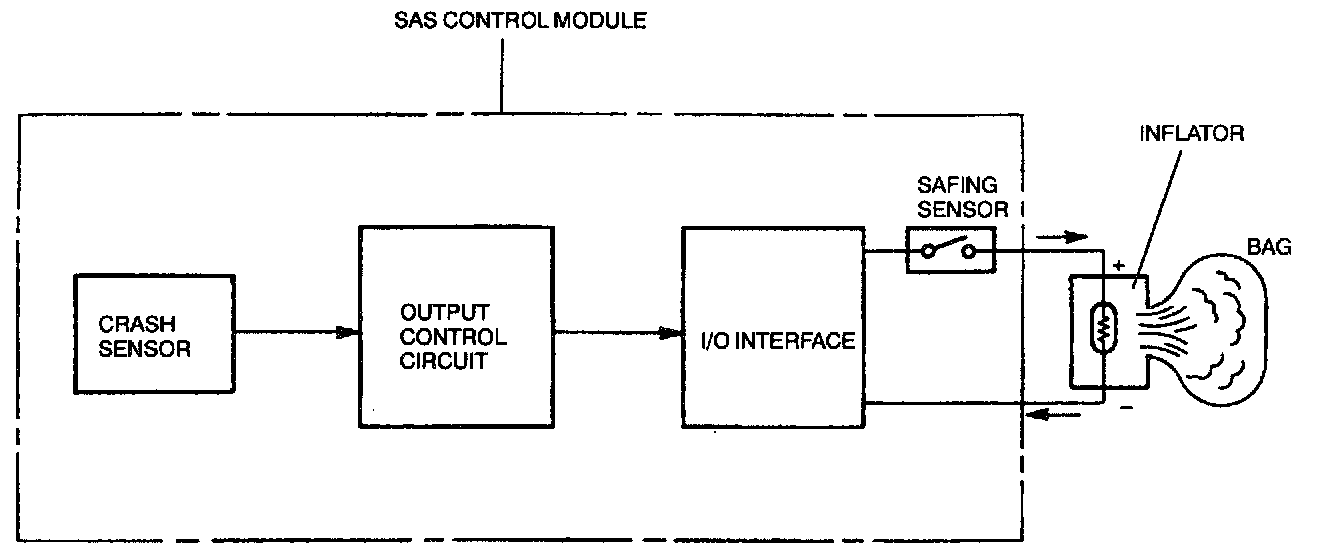 The output control circuit calculates the input electric signal and determines whether or not to send the signal to the I/O (input/output) interface. If the calculated value is more than the value set in the output control circuit, the electric signal is sent to the inflator via the safing sensor.