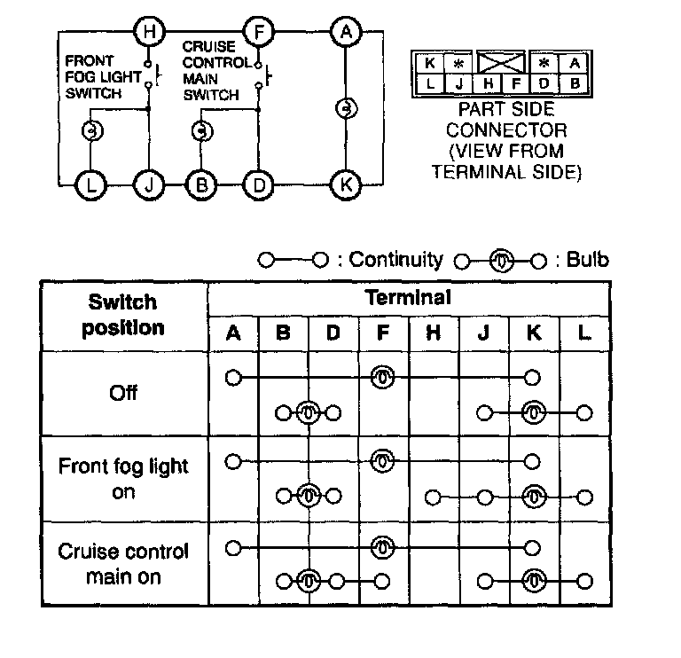 Inspect for continuity between the cruise control main switch terminals using an ohmmeter.