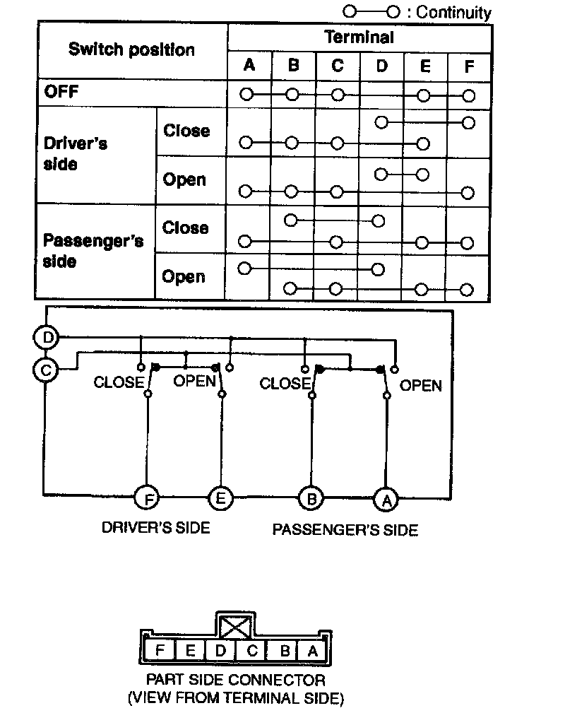 3. Inspect for the continuity between the power window switch terminals using an ohmmeter.