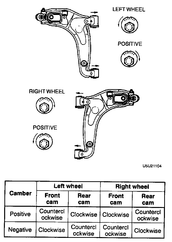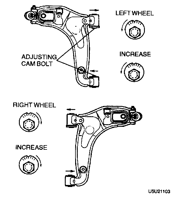 2. Turn the front and rear adjusting cam bolts the same amount in the opposite direction equally to provide the correct camber angle.