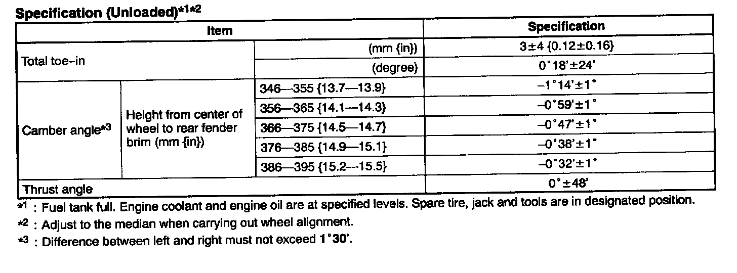 ^ Turning the front cam one graduation changes the camber about 13' and the toe-in about 2.3 mm (0.1 in). Turning the rear cam one graduation changes the camber about 8' and the toe-in about 2.3 mm (0.1 in).