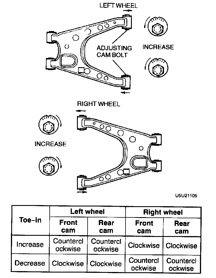 2. Turn the front and/or rear adjusting cam bolts to equally provide the correct toe-in