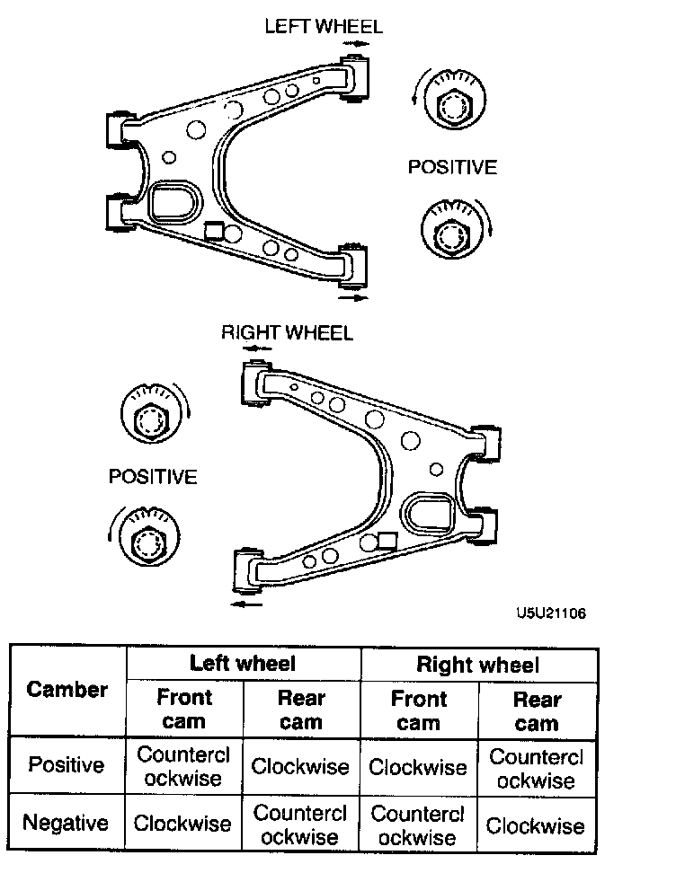 2. Turn the front and rear adjusting cam bolts the same amount in the opposite direction equally to provide the correct camber
