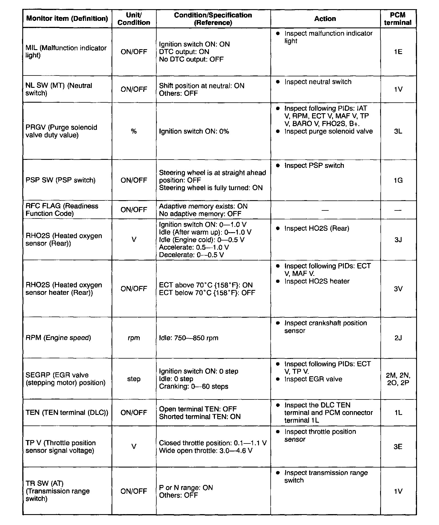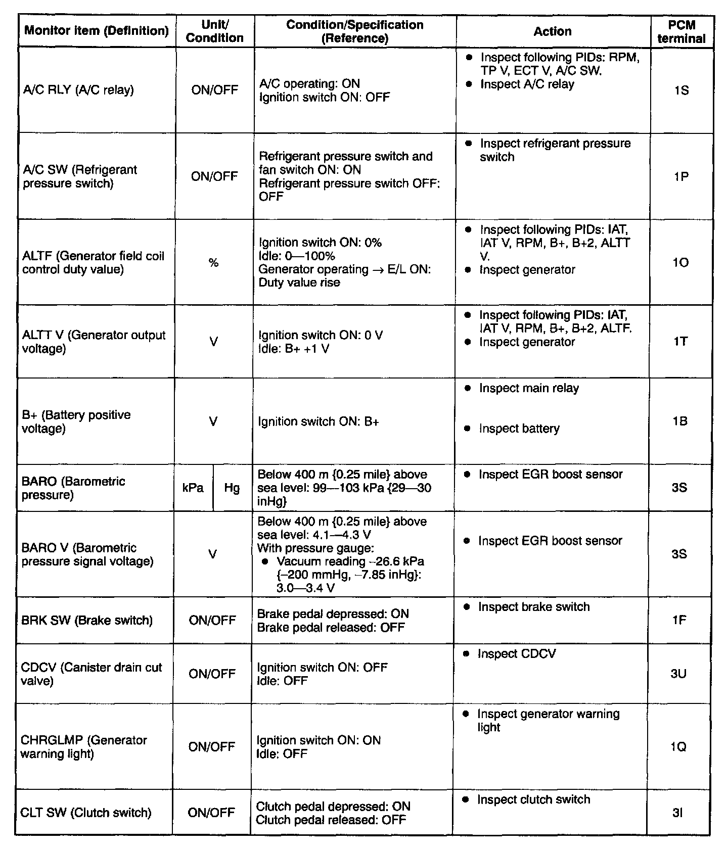 2. Confirm that the following PIDs are within the specifications: