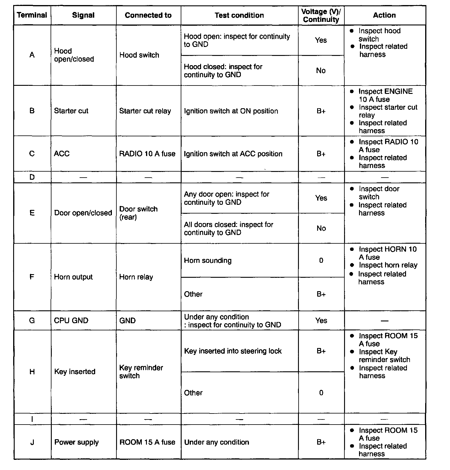 Terminal Voltage Table (Reference) - Pinouts (A - J):