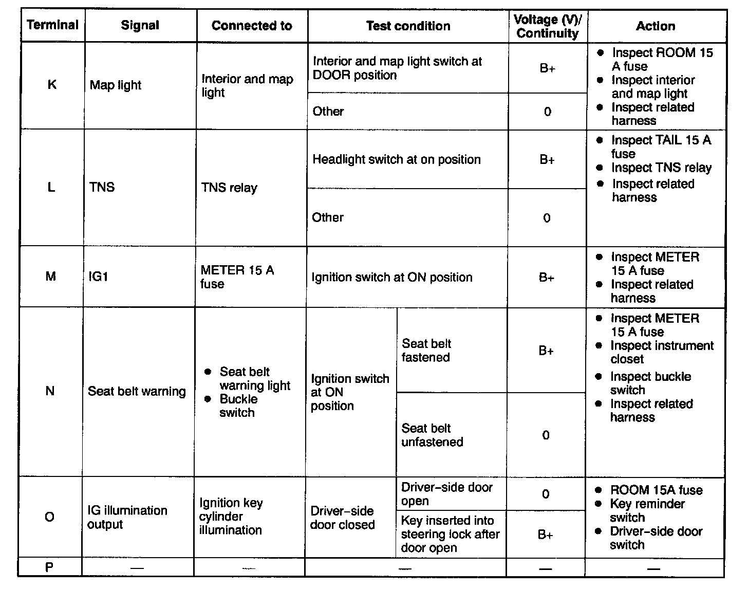 Terminal Voltage Table (Reference) - Pinouts (K - P):