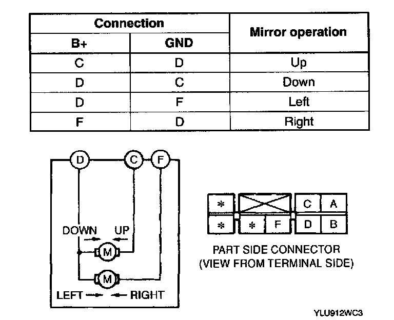 2. Apply battery voltage and inspect the operation of the power outside mirror.