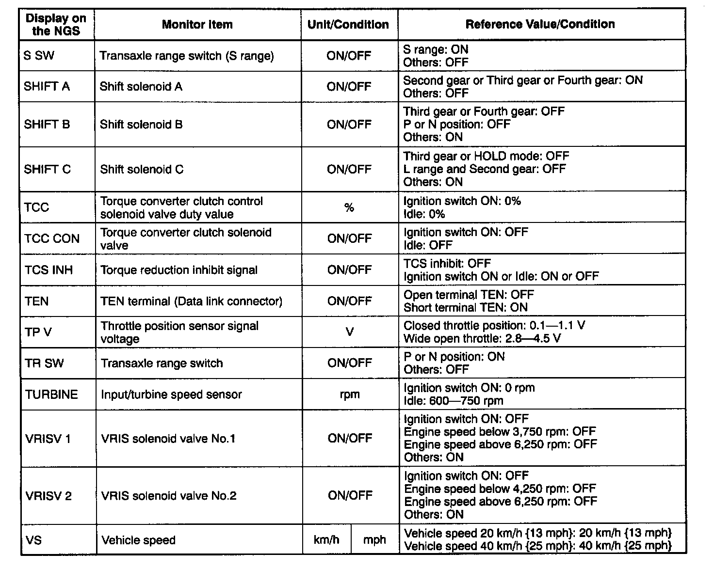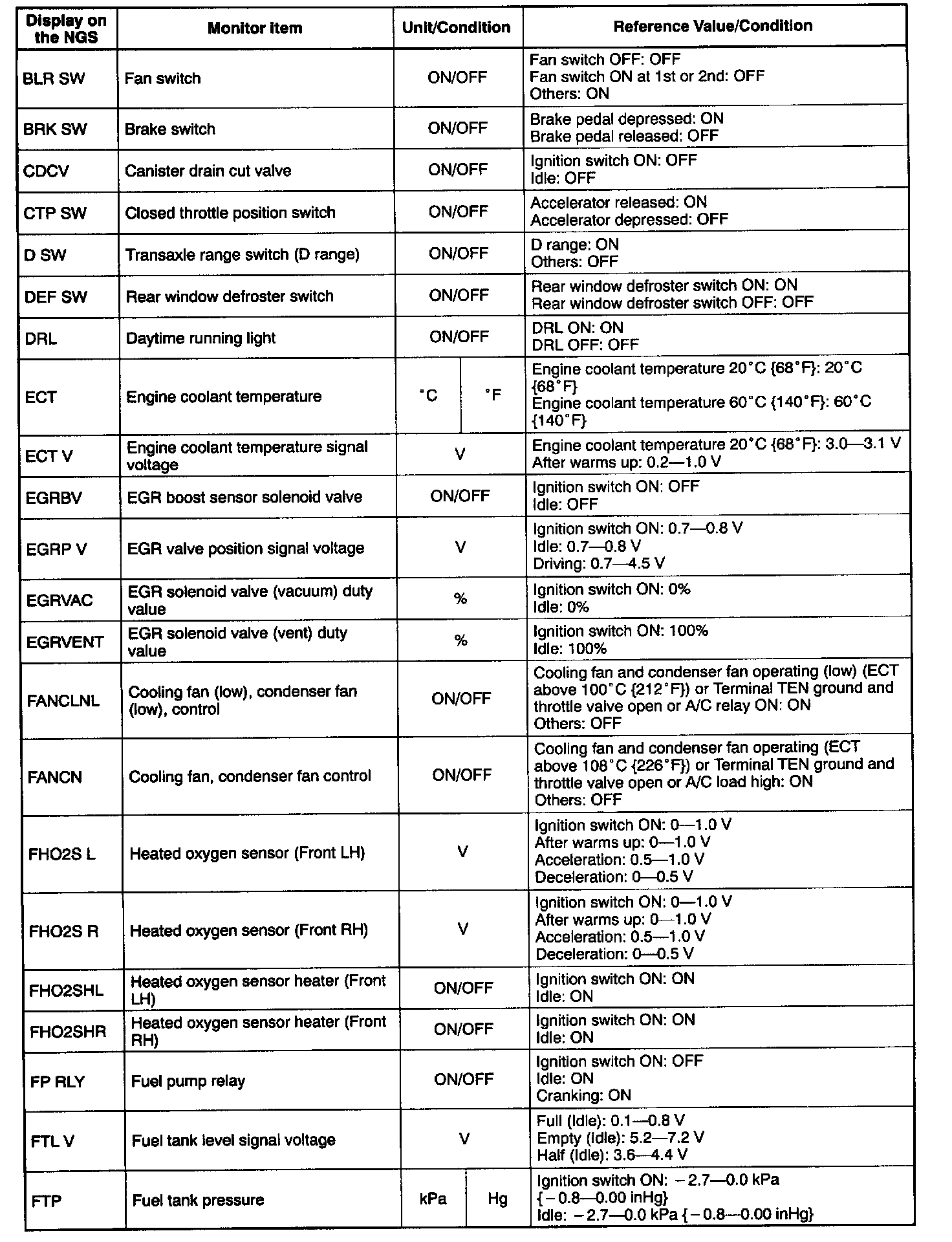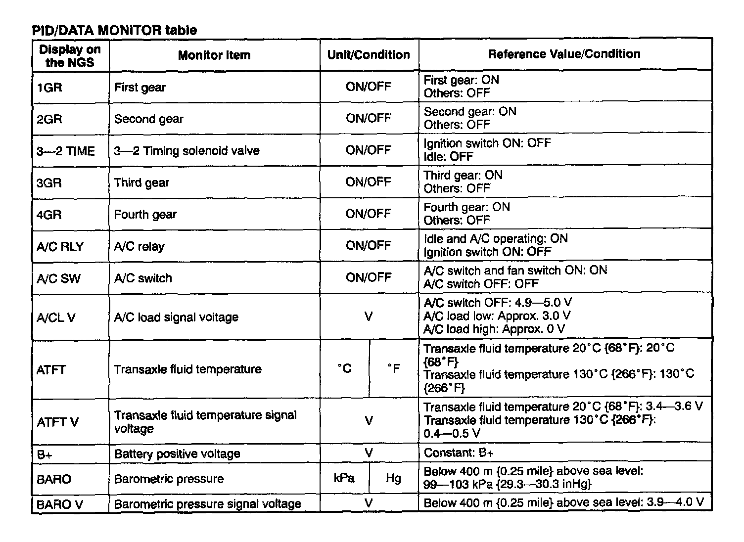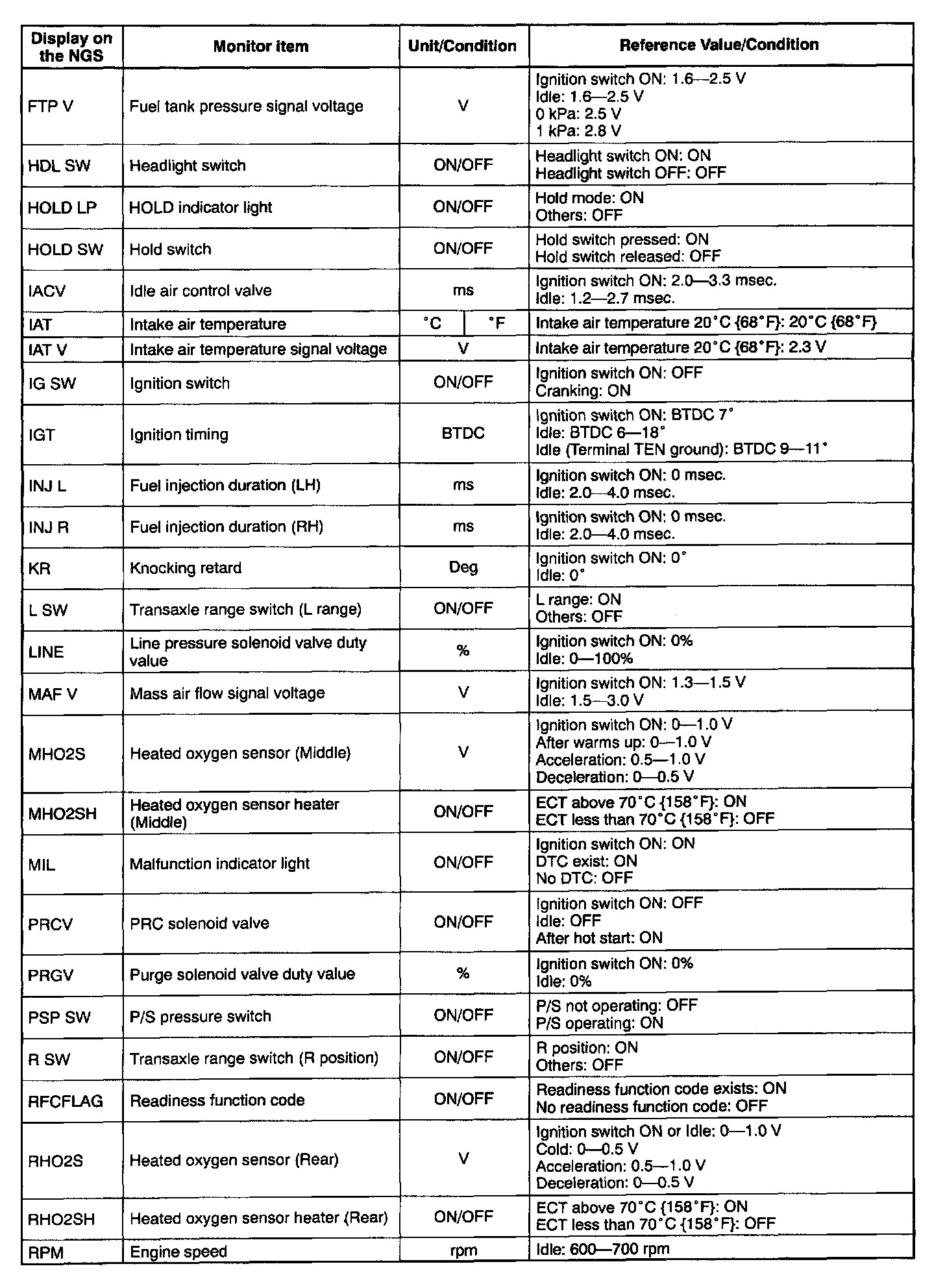 NOTE: The "PID/DATA MONITOR AND RECORD" function is to monitor the calculation value of input/output signals in the PCM. Deviation in the value does not always indicate malfunction in the related input/output devices (sensors and solenoids).