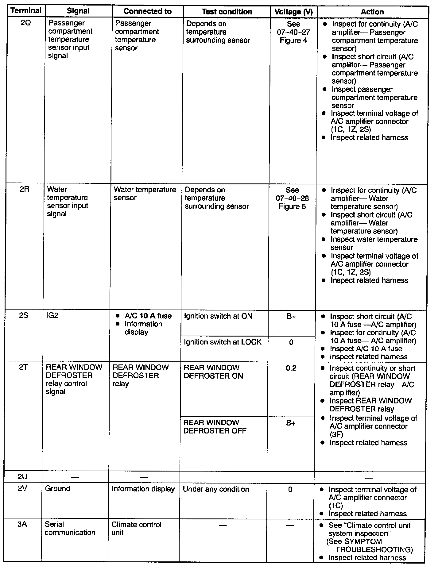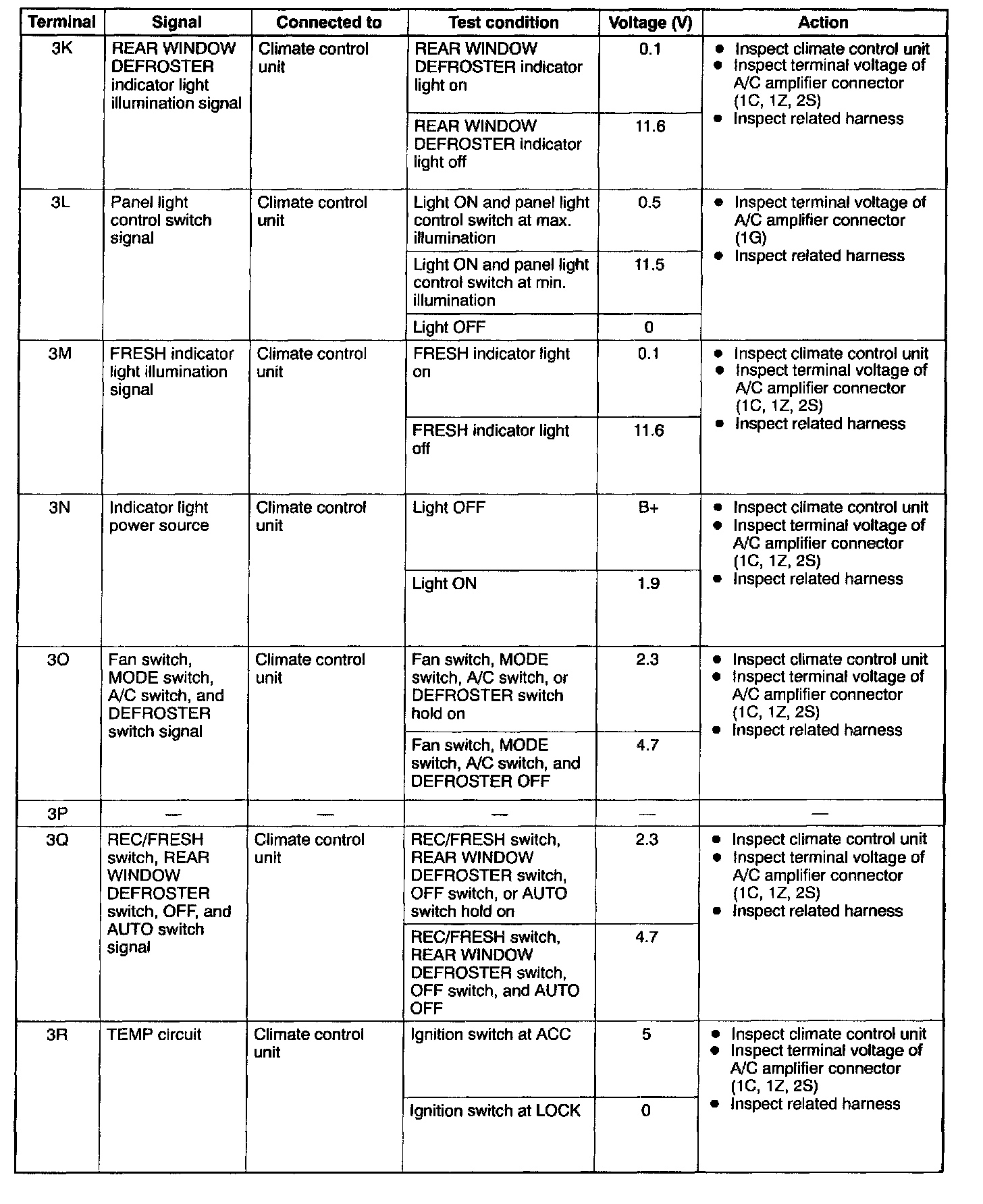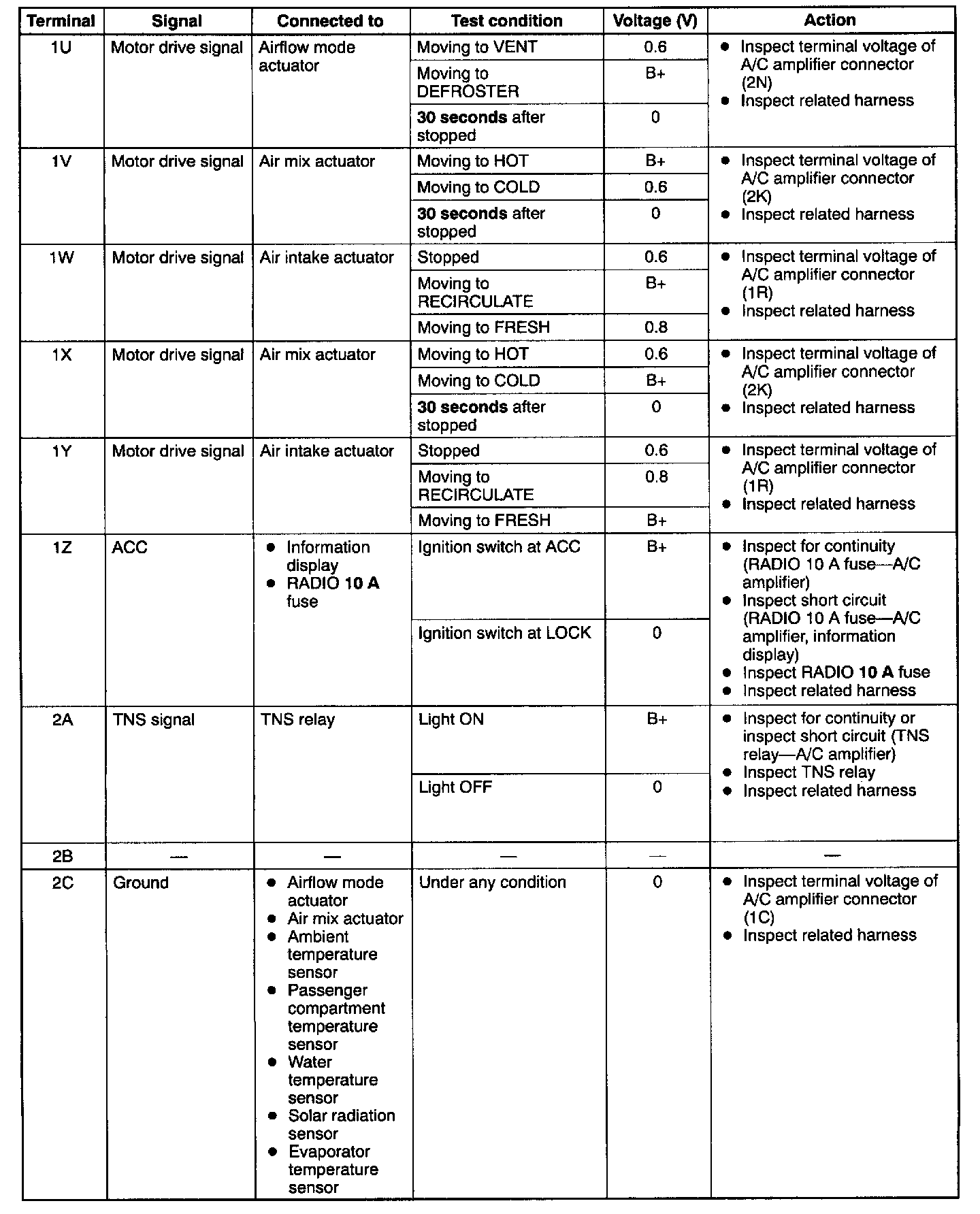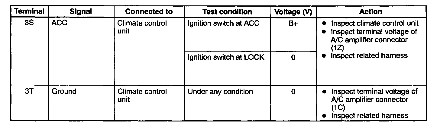 4. Measure the voltage at each A/C amplifier terminal and refer to the terminal voltage table.
