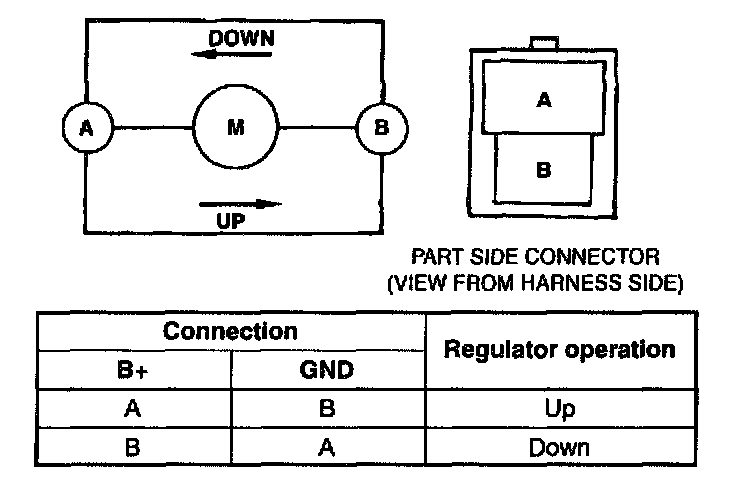 3. Apply battery voltage to the power window regulator connector terminals. Inspect the operation of the regulator.