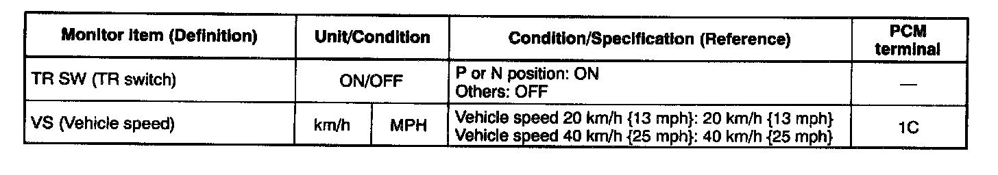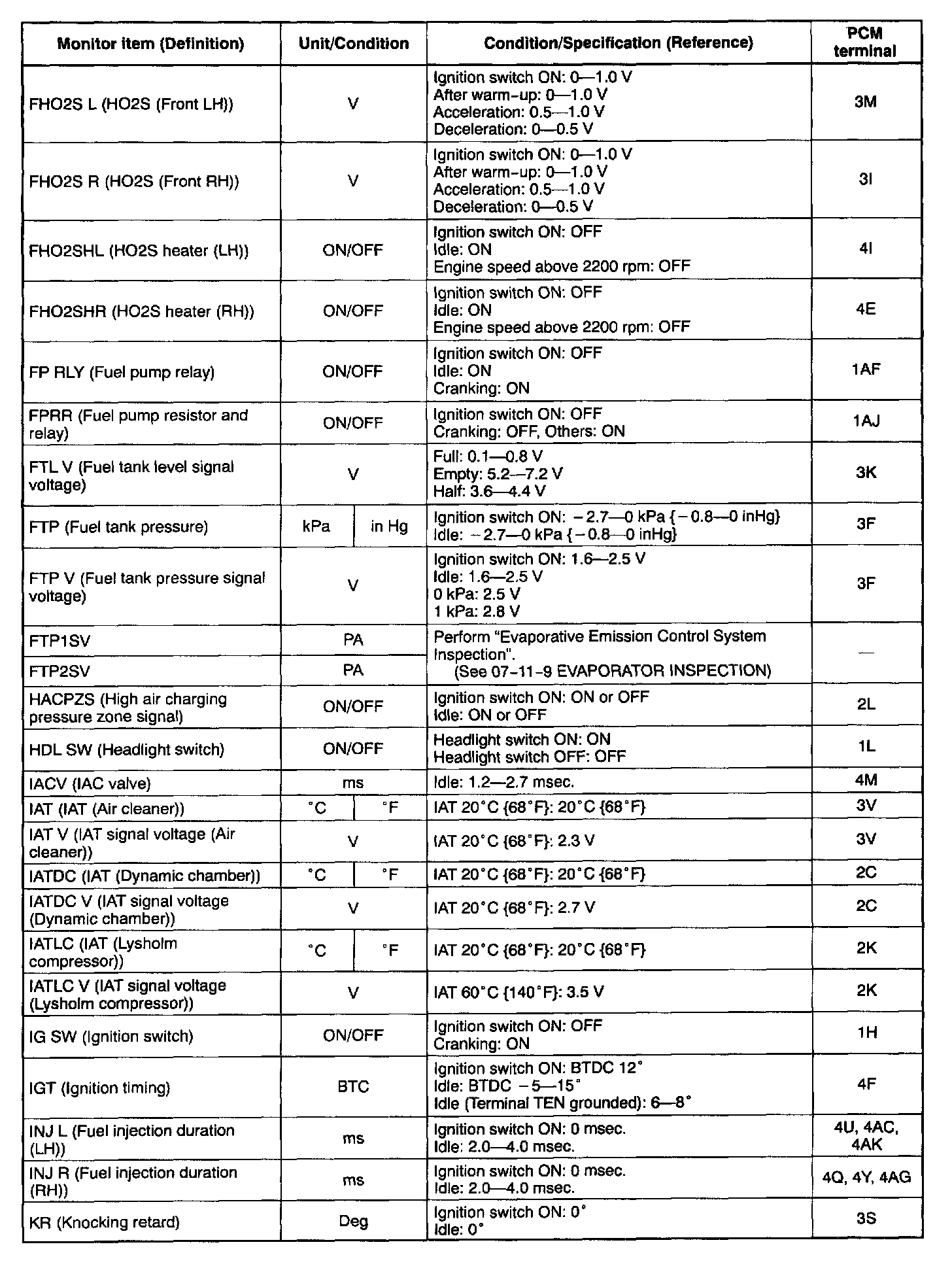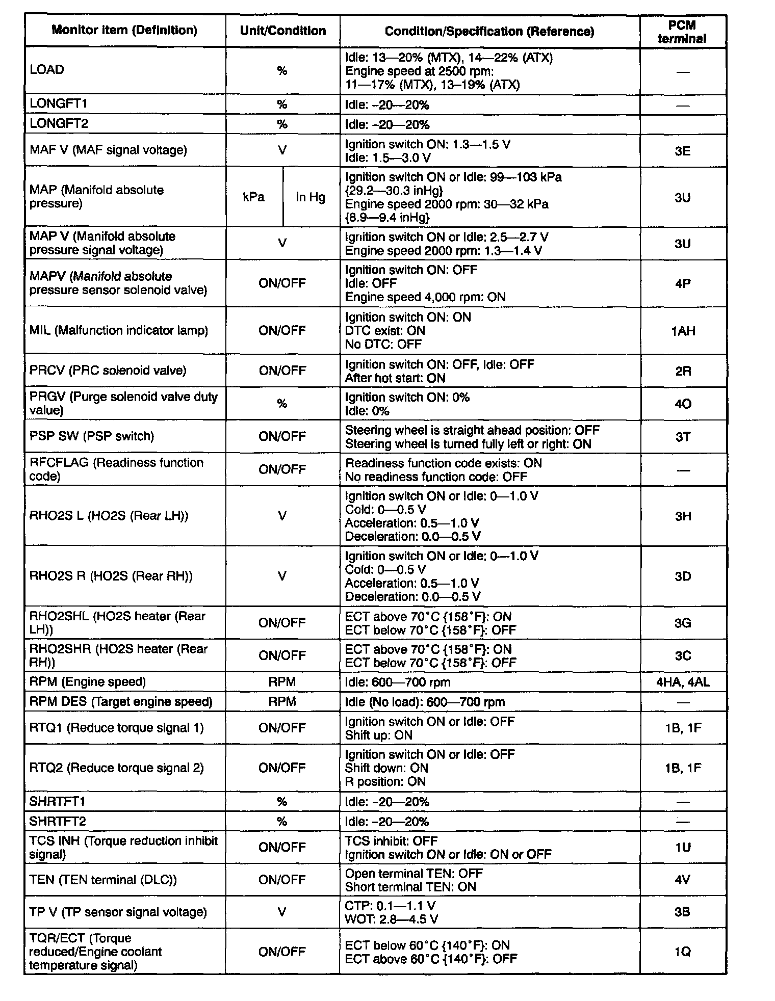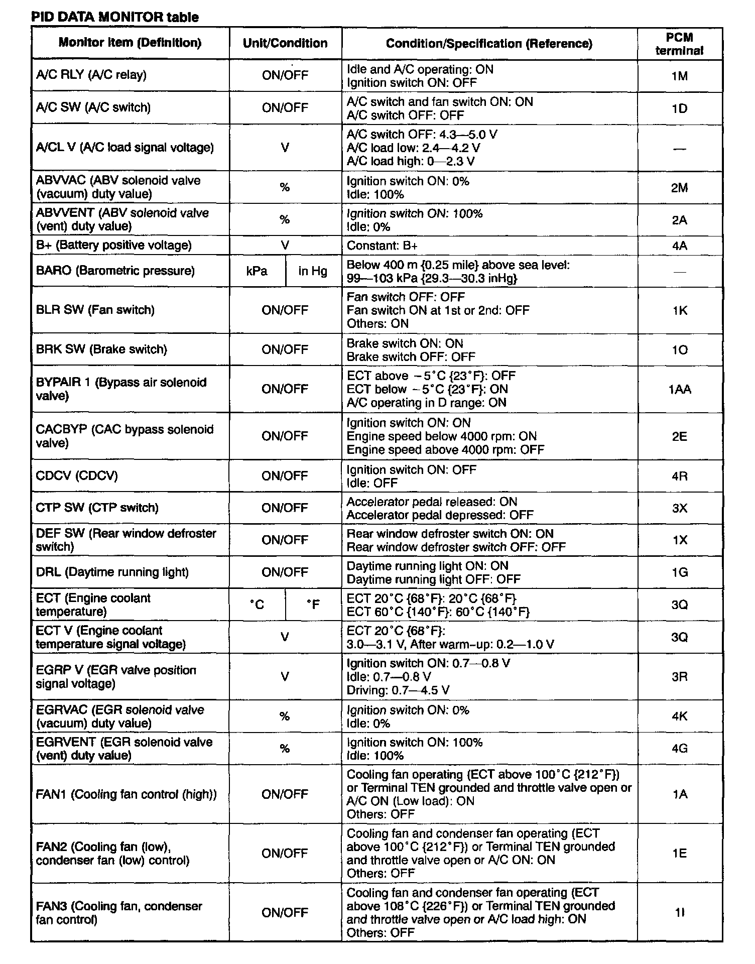 NOTE: The "PID/DATA MONITOR AND RECORD" function is to monitor the calculation value of input/output signals in the PCM. Deviation in the value does not always indicate malfunction in the related input/output devices (sensors and solenoids).