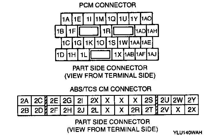 1. Disconnect the PCM connector and ABS/TCS CM connector.2. Verify the continuity between PCM connector terminal 1Q and ABS/TCS CM connector terminal 2S.