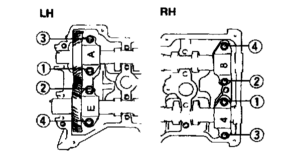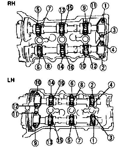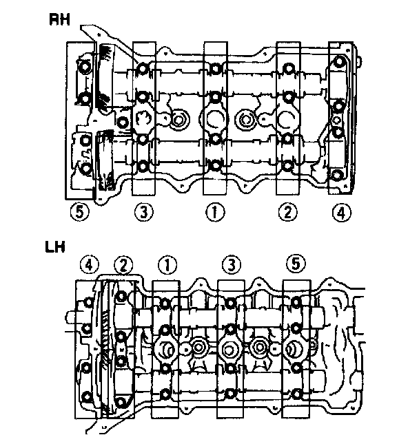 Caution: Install the thrust caps (RH: 4, 8 marks, LH: A, E marks) first. Otherwise, the camshaft can be broken or damaged.