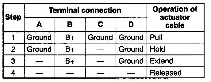 6. Connect B+ and a ground to the terminals as shown and confirm the operation of the actuator cable.